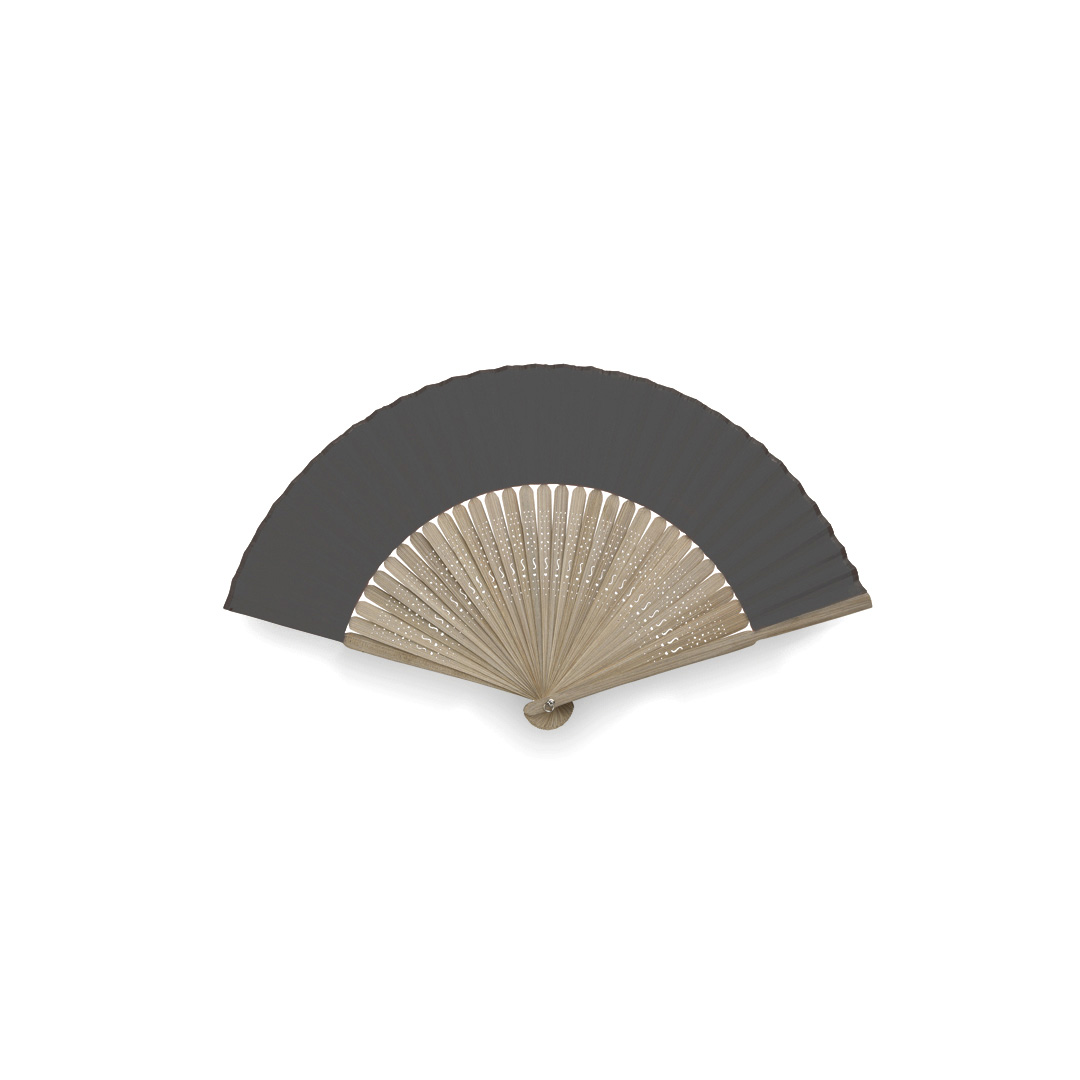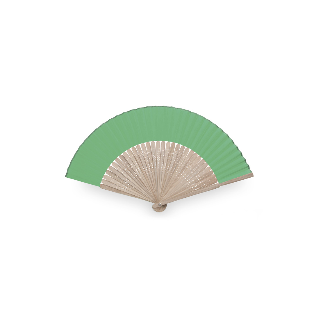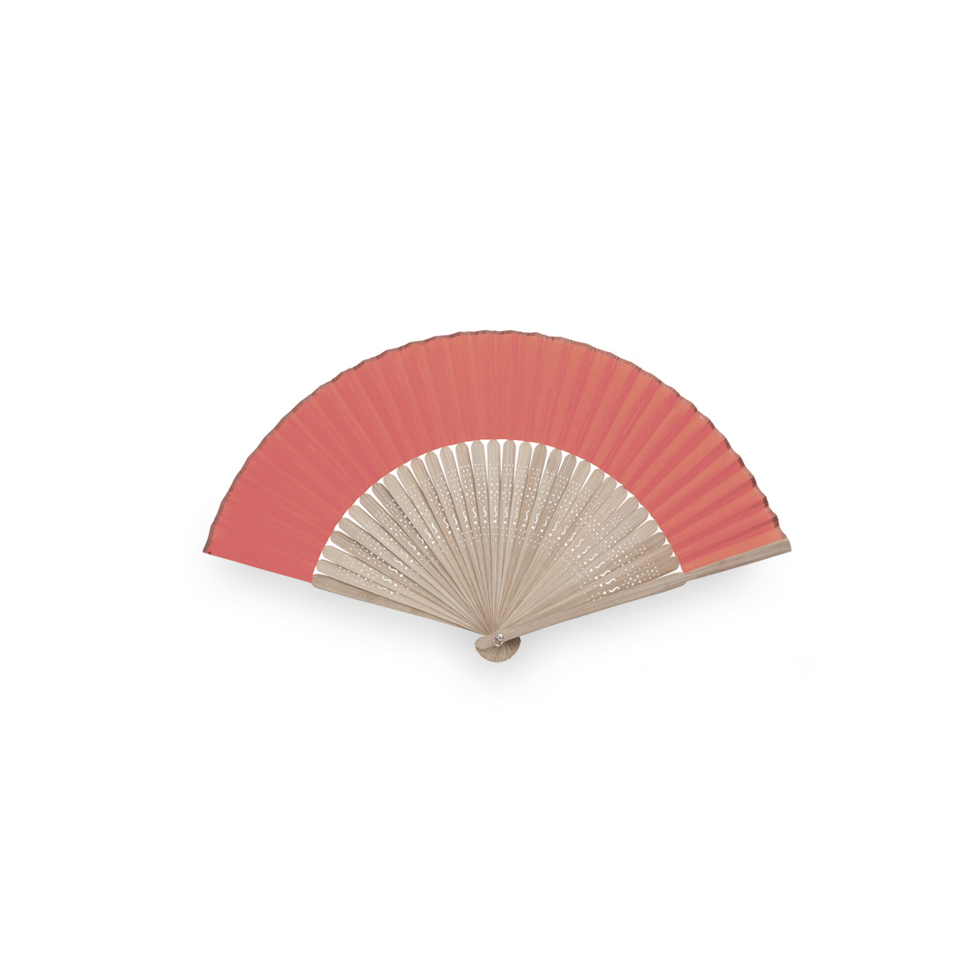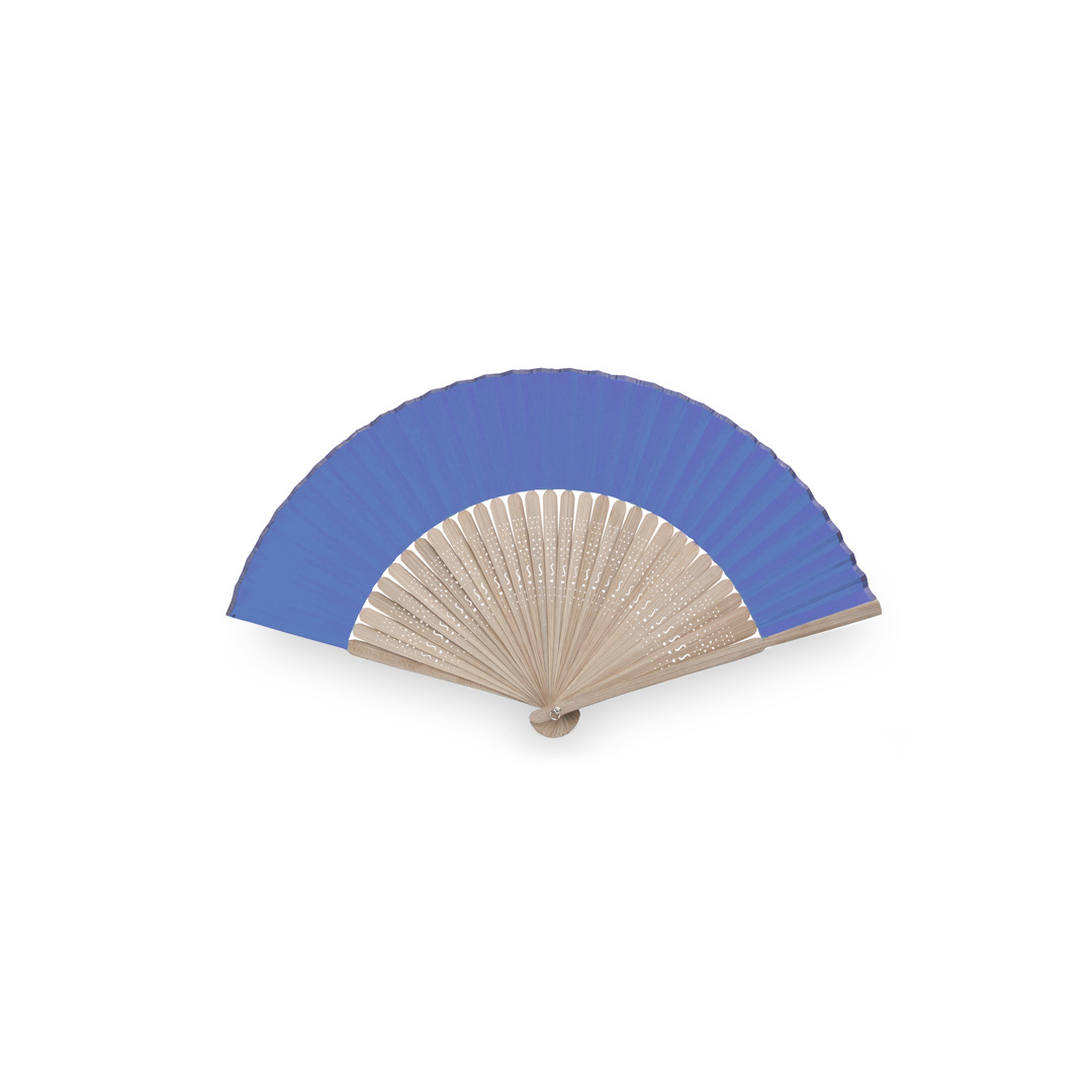 Abanico de varillas de madera troquelada y tela en poliéster de variados colores. Con ribete y presentado en bolsita de tela individual con cierre de lacito.