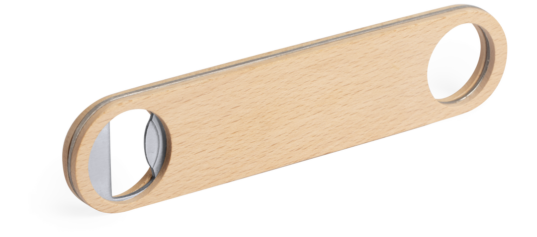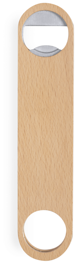 Abridor de madera de haya pulida con interior en acero inox, con troquelado para colgar.