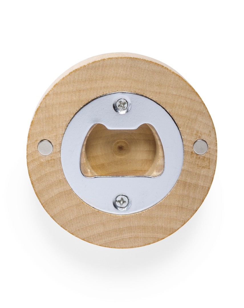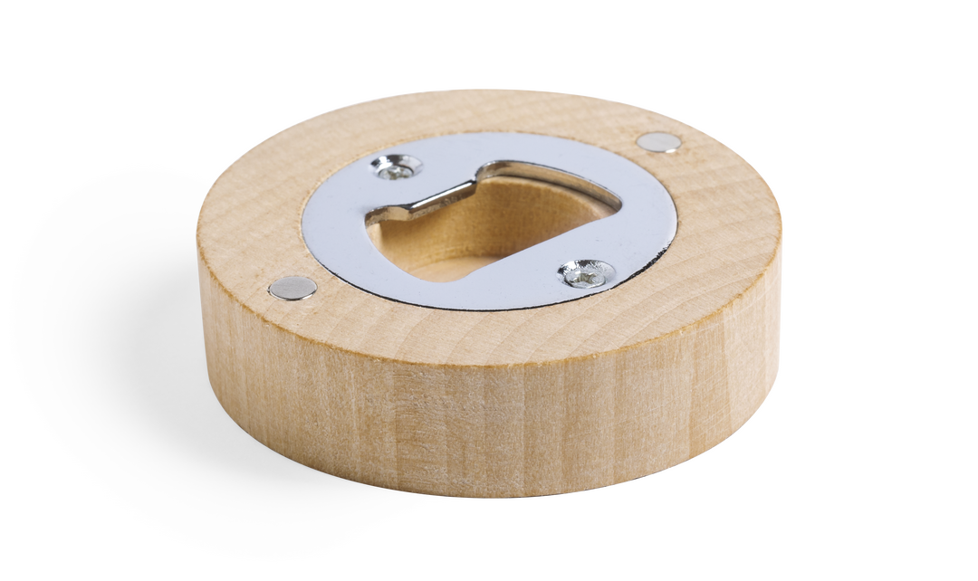 Abridor en madera con interior magnético en acero inox y original diseño circular. Presentado en bolsa individual. Magnético