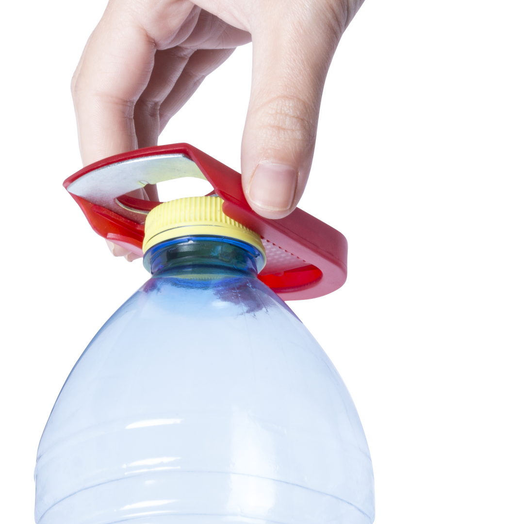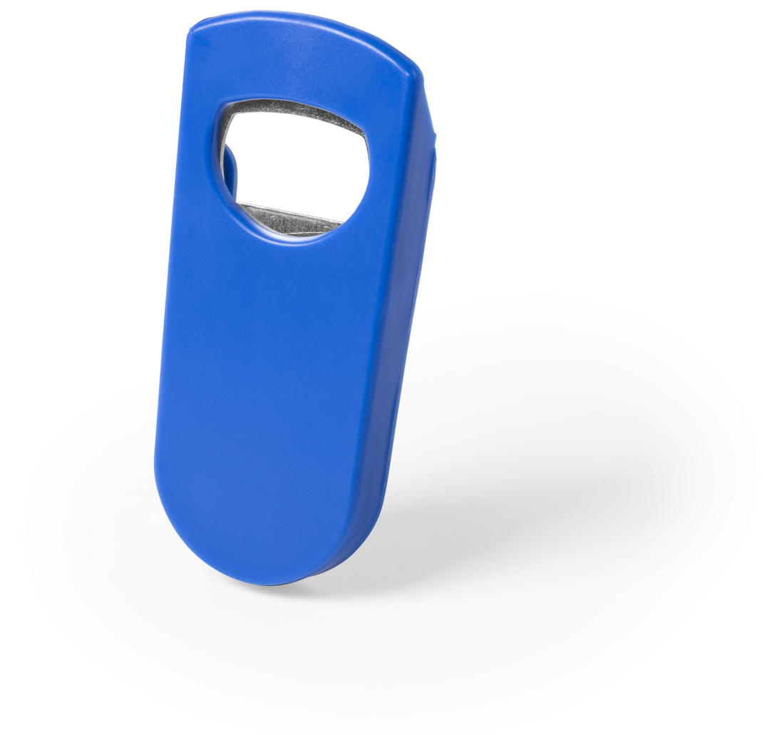 Abridor con resistente cuerpo en variados colores y pieza de apertura metálica. Parte trasera con función tapón para botellas.