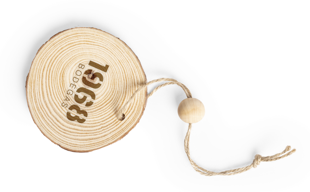Adorno navideño en madera natural al corte, con lacito para colgar y bola a juego. Ideal para marcaje en láser.