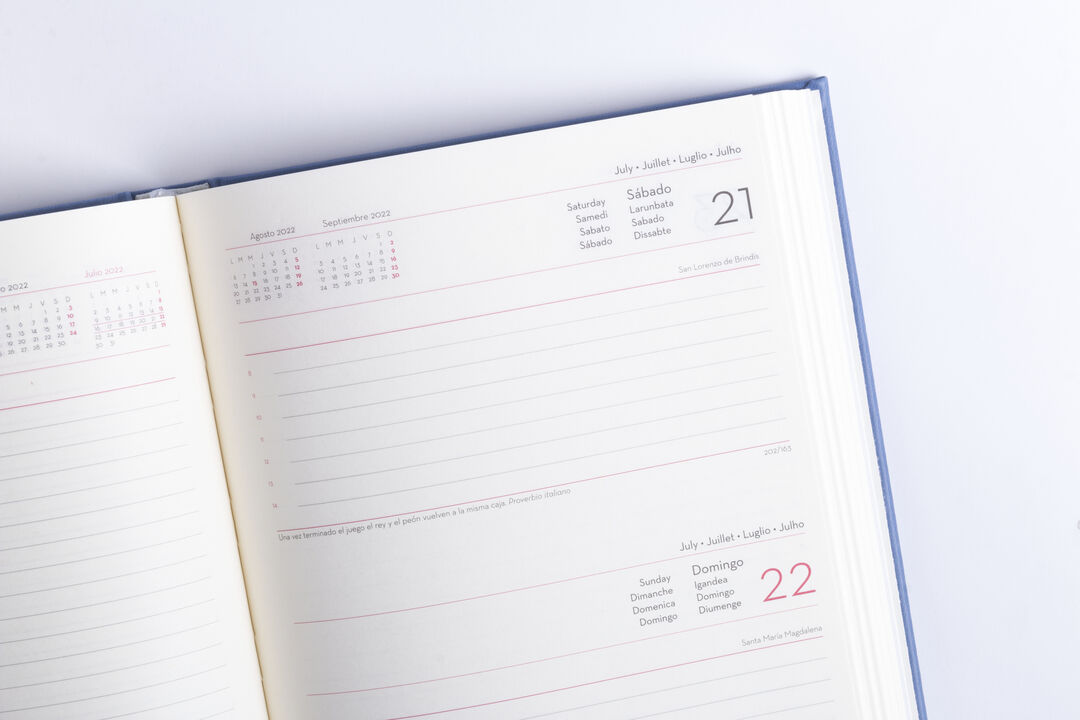 Diseño página día, y marcapáginas, con frase diaria. 8 idiomas: castellano, inglés, francés, italiano, portugués, gallego, euskera y catalán. Página Día