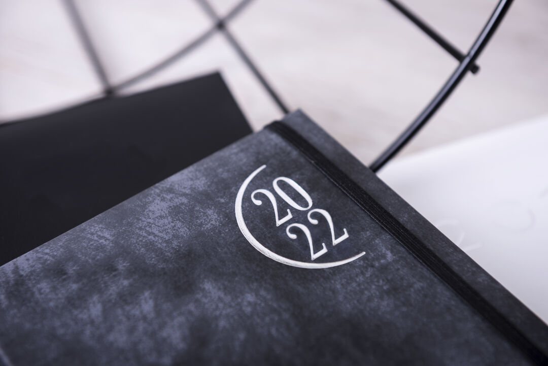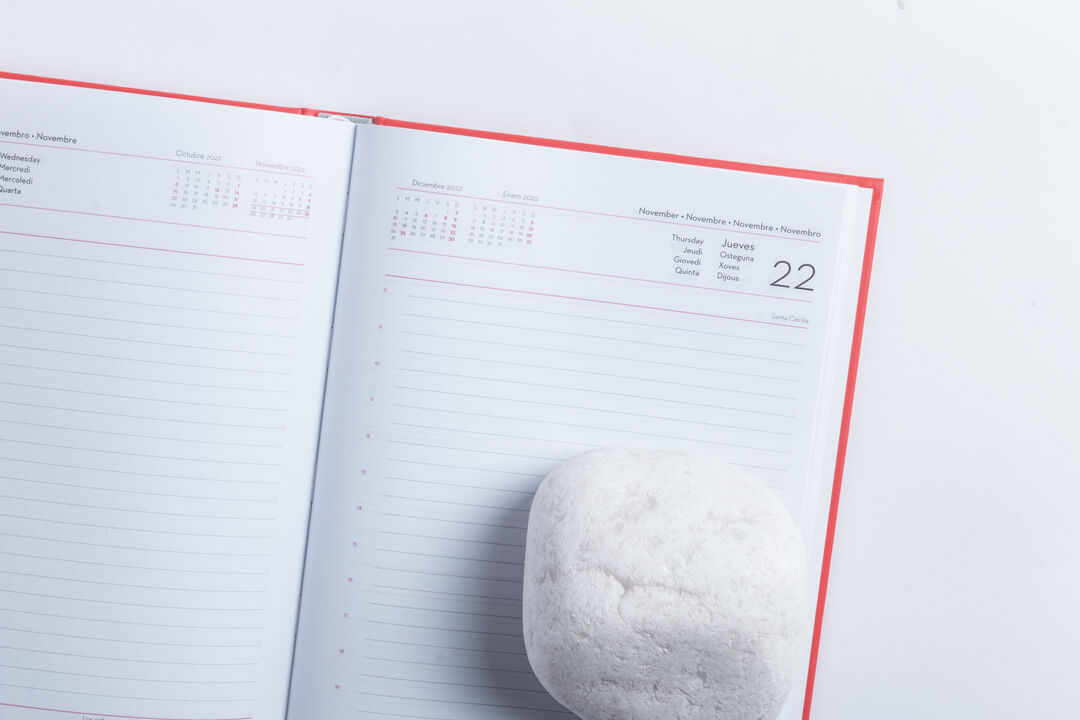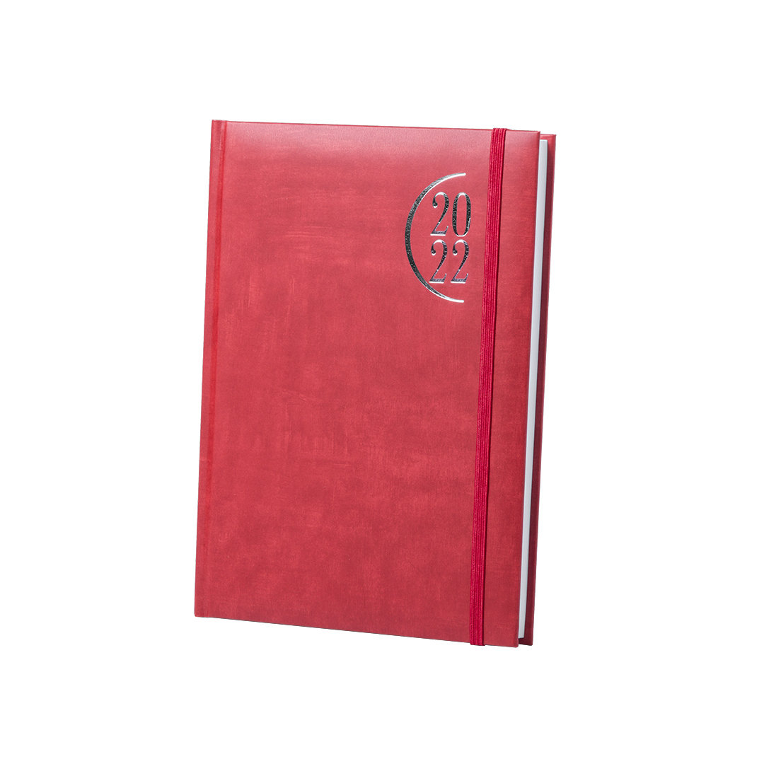 Agenda de tamaño A5 acabada en resistente y suave polipiel con acolchado, elástico de sujeción a juego y de variados colores. Diseño página día. En castellano, inglés, francés, italiano, portugués, gallego, euskera y catalán. Página Día