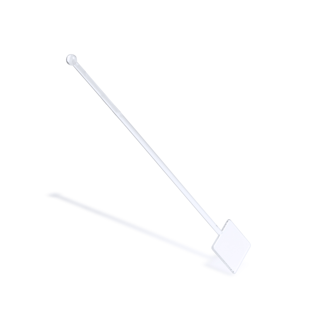 Agitador para bebidas de 21cm de cuerpo transparente. Con bola en parte inferior y corona rectangular para marcaje.