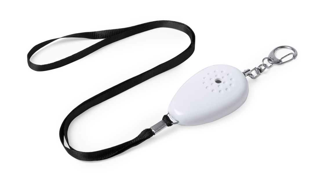 Alarma personal con potente timbre de volumen extra fuerte. El funcionamiento es sencillo, solamente hay que tirar de la cinta para que suene la alarma. Con mosquetón metálico de enganche y cinta resistente de 36 cm de largo. Alimentación a pilas (de botó Pilas Botón Incluidas
