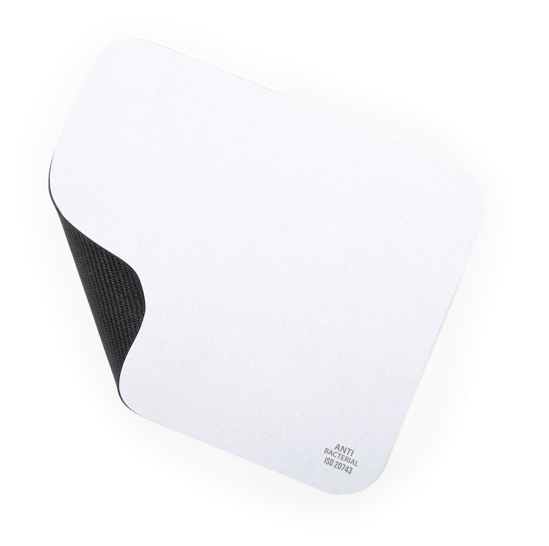 Alfombrilla antibacteriana de diseño rectangular en material poliéster de acabado blanco, con base antideslizante en silicona de 1,5mm de grosor y amplia superficie de impresión, especialmente indicada para impresión en sublimación. Los productos con tra