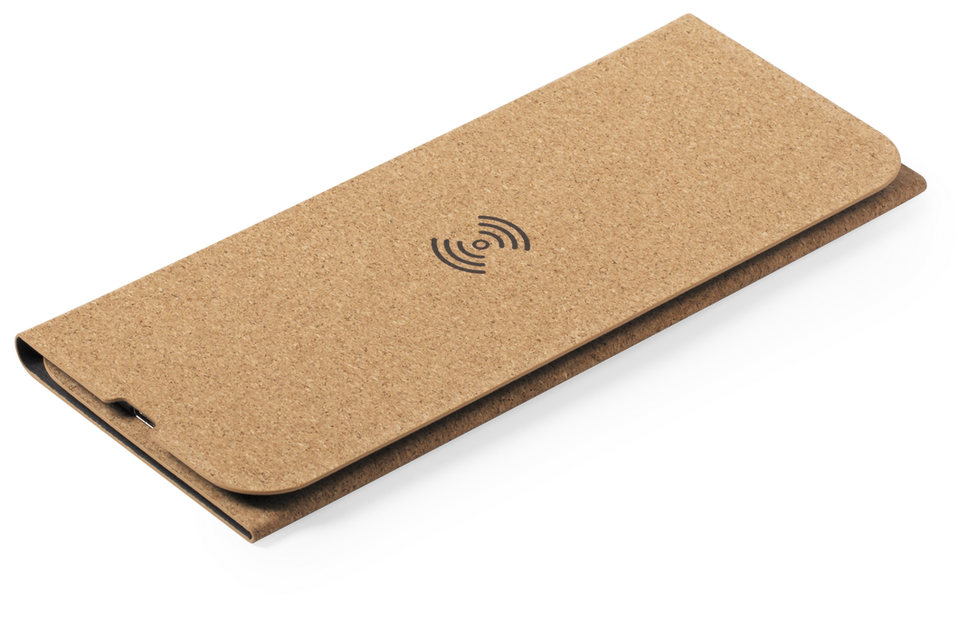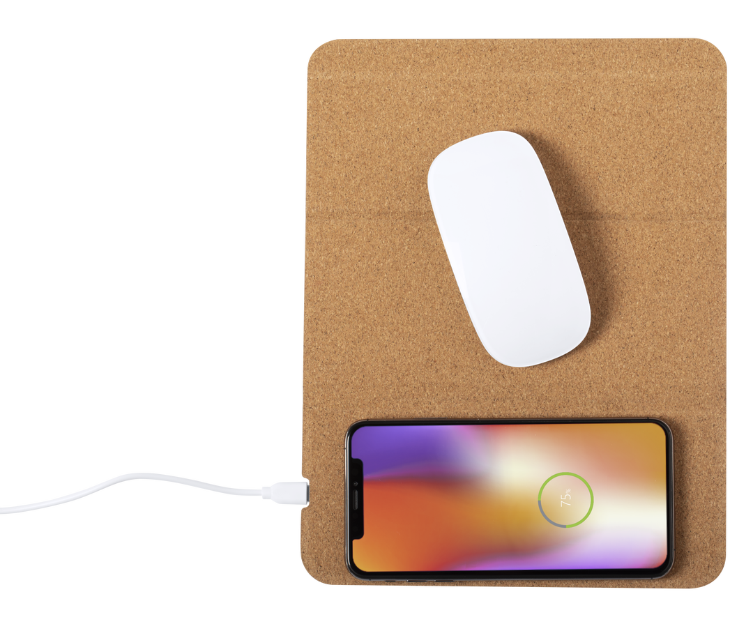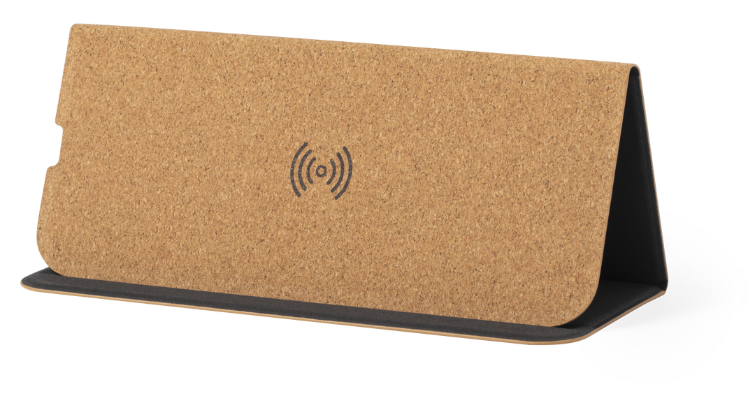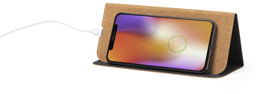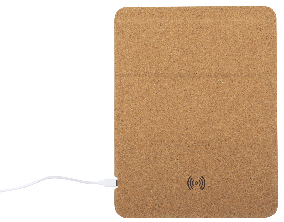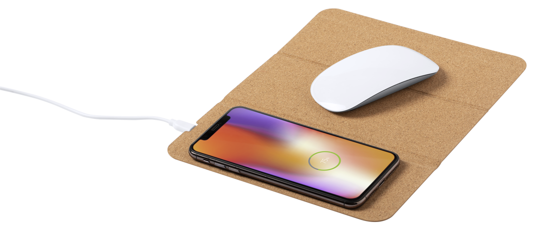 Alfombrilla de línea nature en corcho natural. Con cargador inalámbrico integrado -cable Tipo C incluido-, base antideslizante y soporte para móvil integrado. Compatible con dispositivos equipados con tecnología de carga inalámbrica y presentada en atract Inalámbrico. Cable Incluido