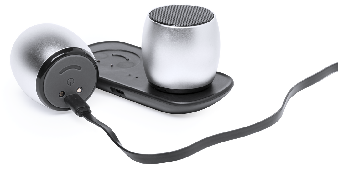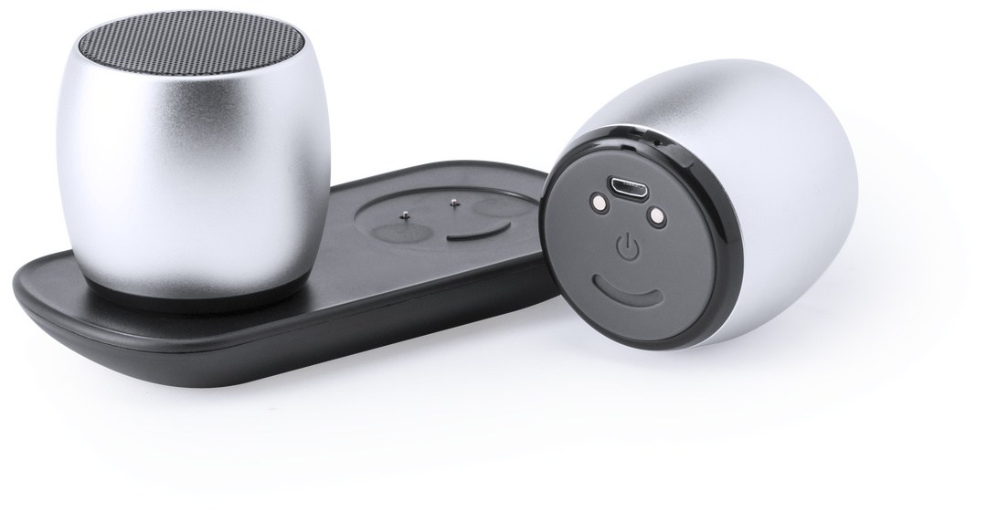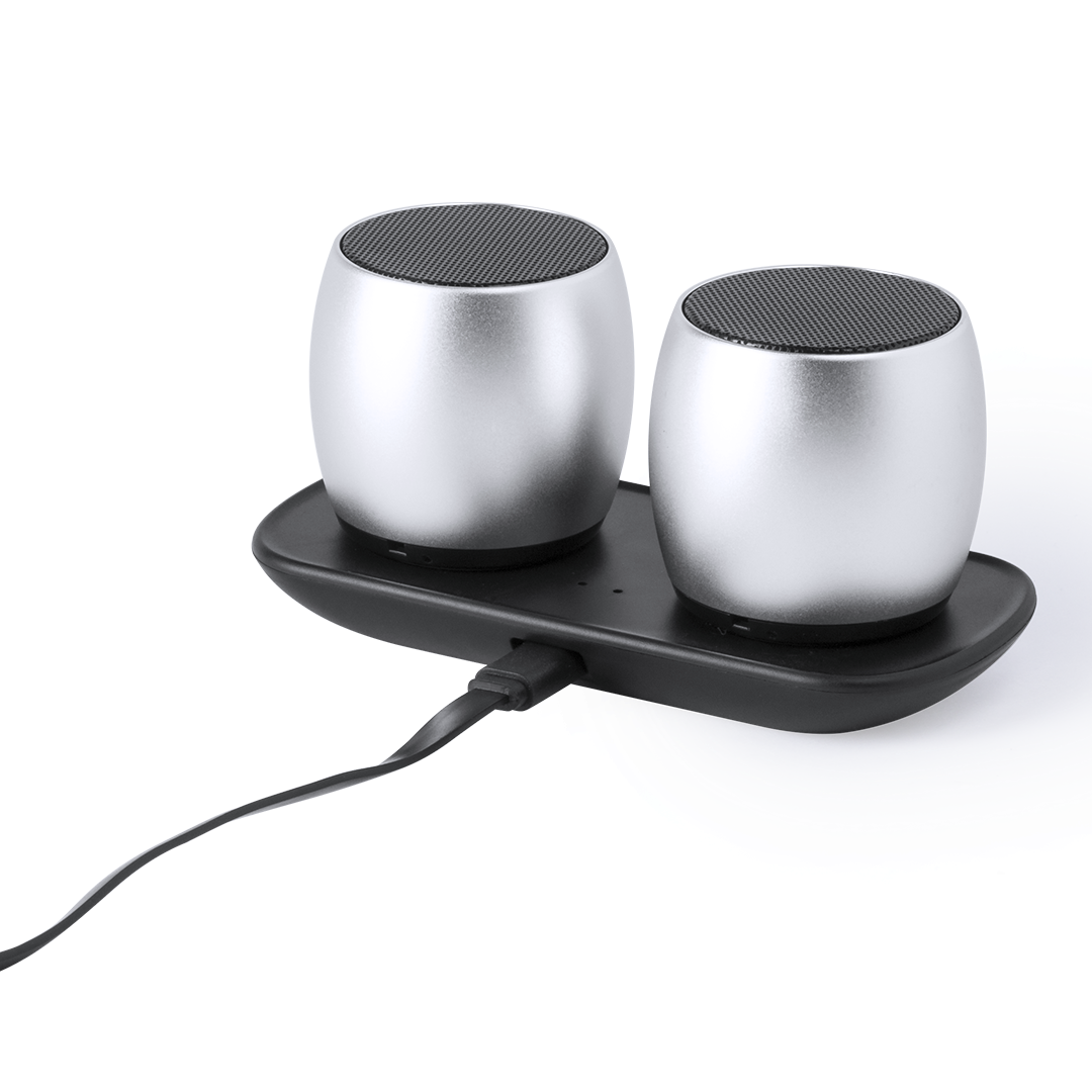 Pareja de altavoces estéreo con conexión Bluetooth®. En aluminio, con rejilla metálica y base recargable mediante cable USB -incluido-. Potencia 2x3W y sonido impactante. Con función manos libres, base antideslizante y presentados en una atractiva caja de Conexión Bluetooth. Potencia 3Wx2. Recargable USB. Cable Incluido
