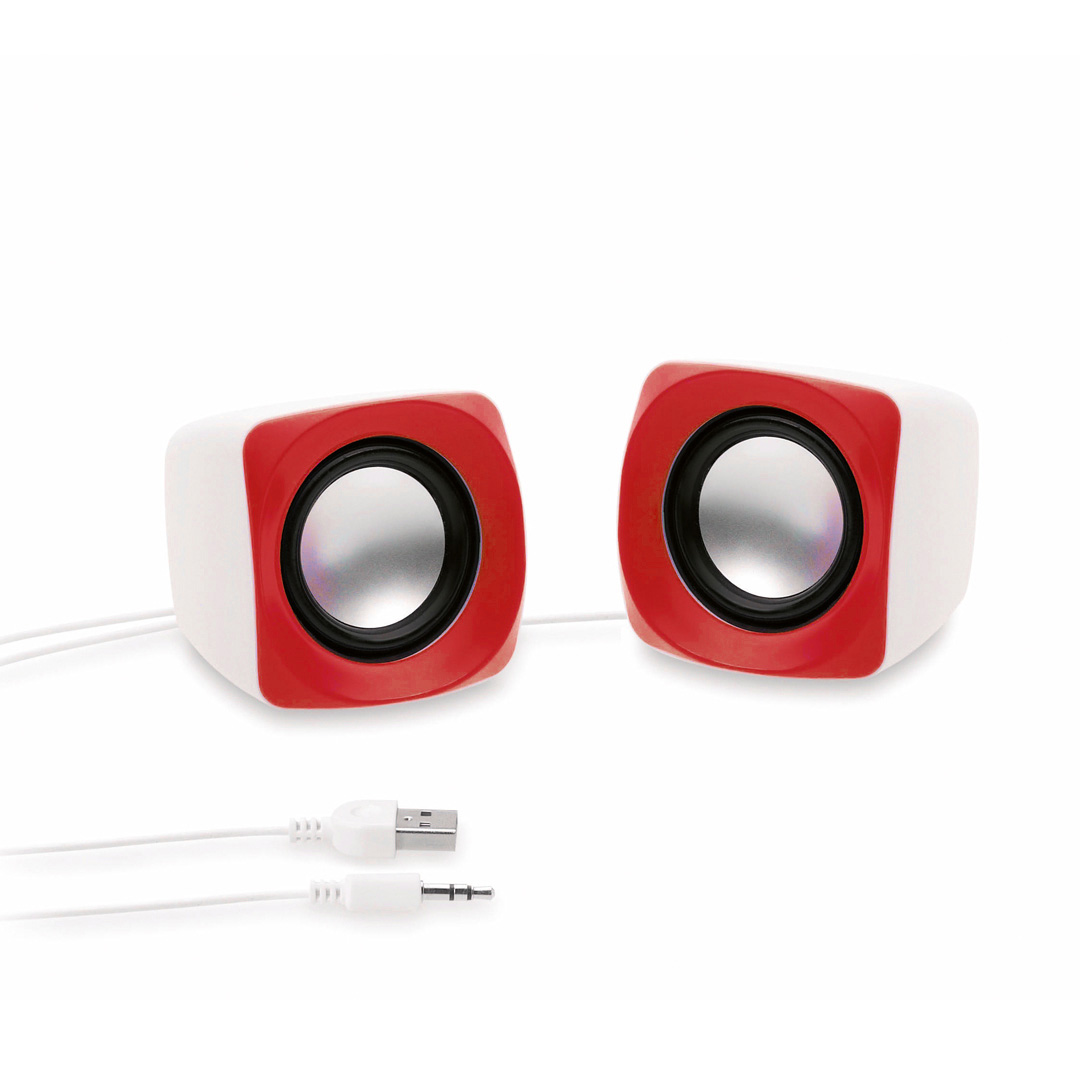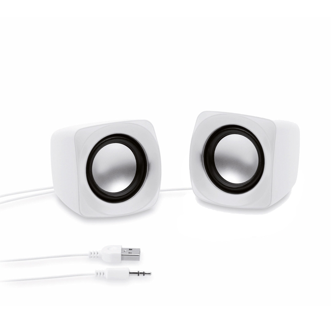 Pareja de altavoces de escritorio en diseño minimalista bicolor. Ofrecen 3W de potencia y reproducción mediante conexión jack de 3,5mm. Alimentación por cable USB -incluido- y presentados en atractiva caja de diseño. Conexión USB. Conexión Jack 3,5 mm