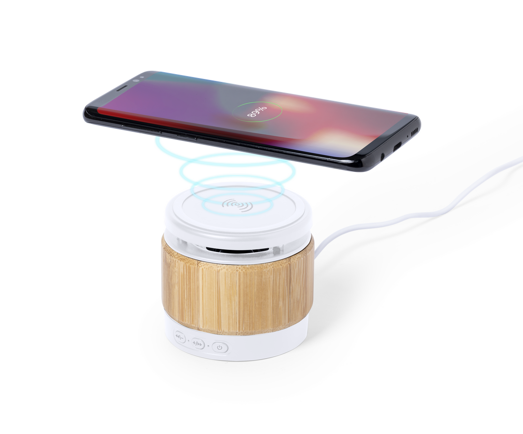 Altavoz Bluetooth® de línea nature con cargador inalámbrico integrado 5W y diseño compacto. Fabricado en combinación de materiales bambú y ABS, de elegante acabado bicolor. Conexión Bluetooth® 5.0 y 3W de potencia. Recargable mediante cable USB -de 150 cm Inalámbrico. Conexión Bluetooth. Potencia 3W. Recargable USB. Cable Incluido