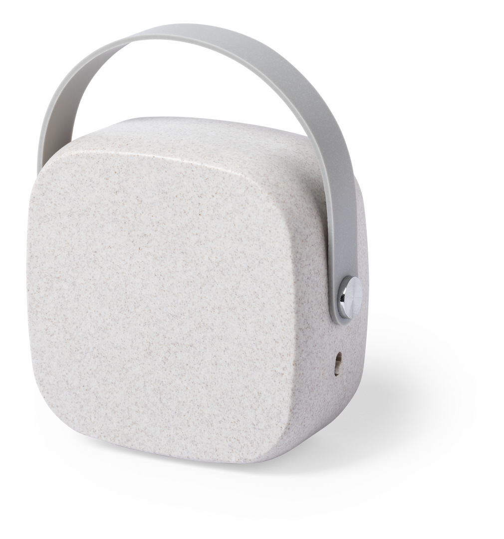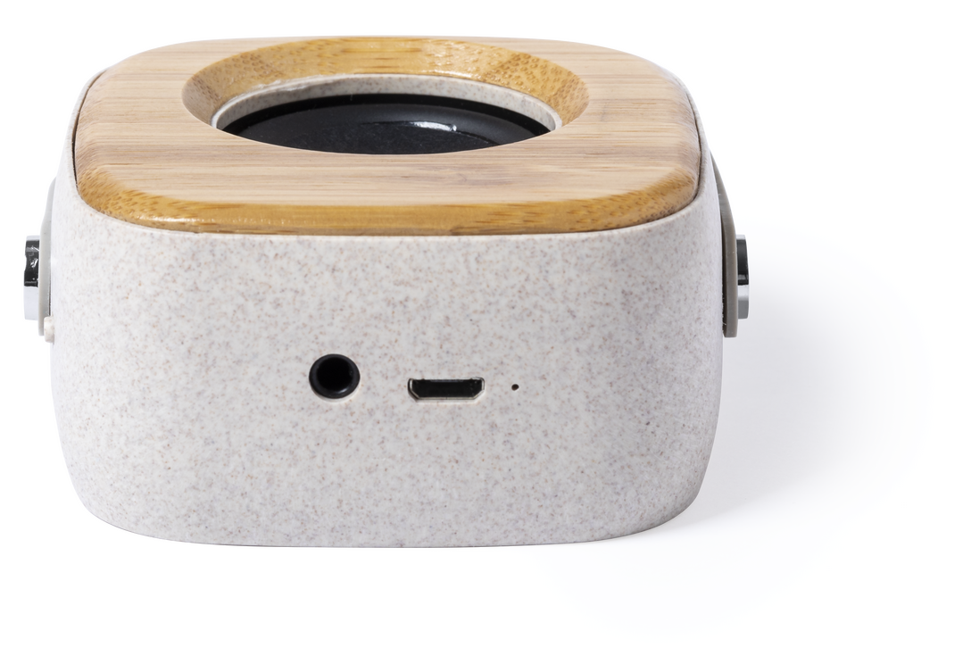 Altavoz Bluetooth en combinación de piezas de bambú de corte nature y carcasa en caña de trigo, para así fomentar la utilización de materias primas naturales y reducir las emisiones contaminantes. De tamaño compacto y con práctica asa de transporte en su Conexión Bluetooth. Potencia 3W. Recargable USB. Cable Incluido