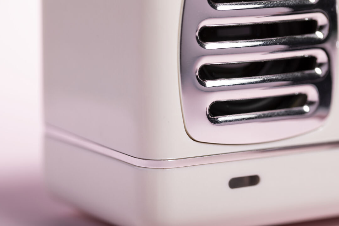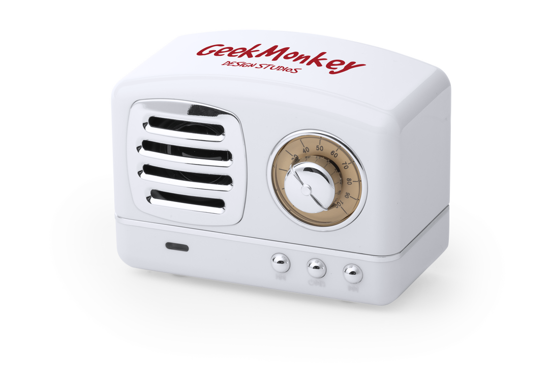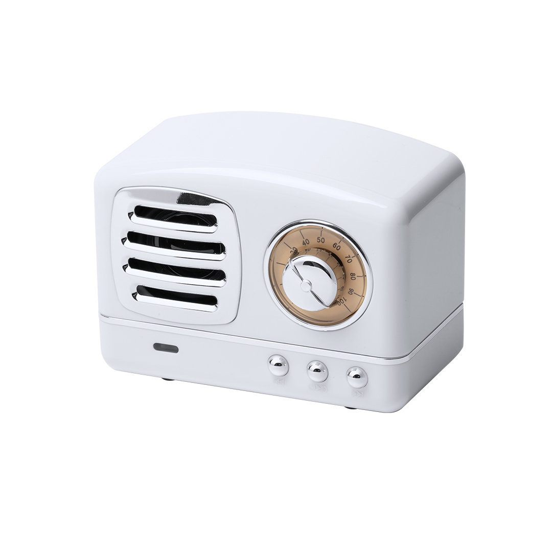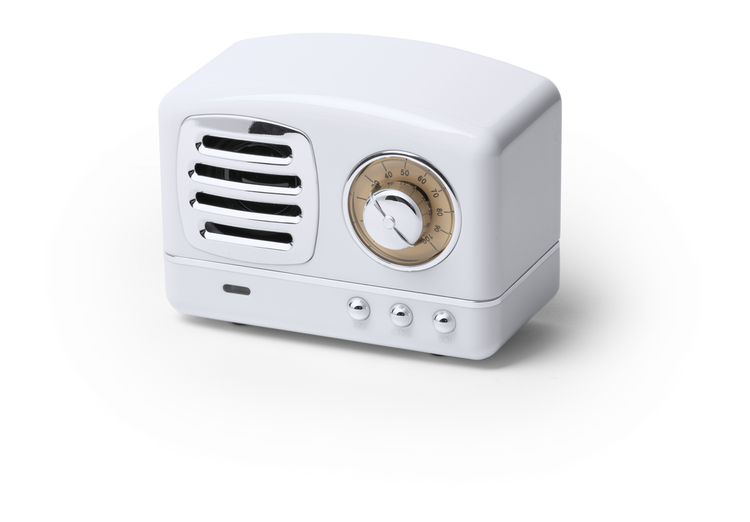 Altavoz de conexión Bluetooth® de diseño vintage, con rejilla en color plateado y botón de control de volumen giratorio. Elaborado en plástico ABS y con conexión Bluetooth® 5.0, ofrece 3W de potencia, tiene función de manos libres, reproductor USB, ranura Conexión Bluetooth. Potencia 3W. Recargable USB. Cable Incluido