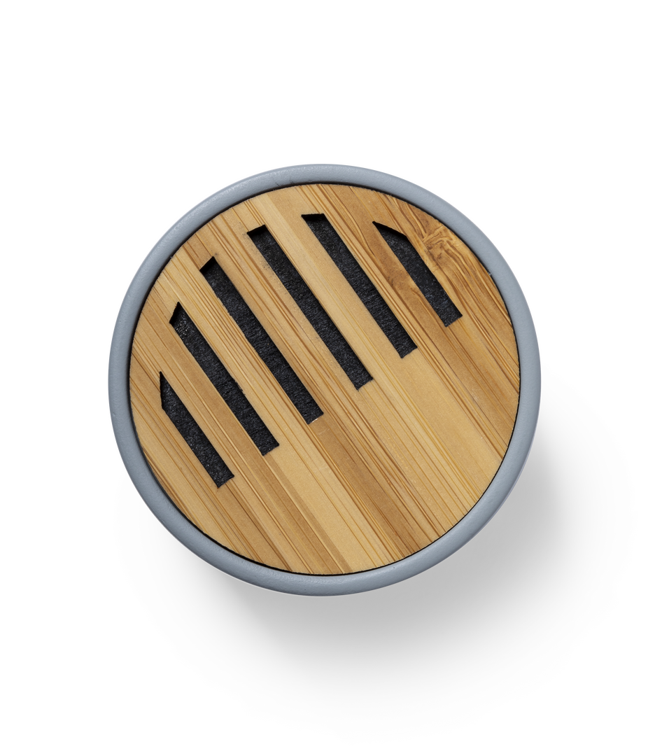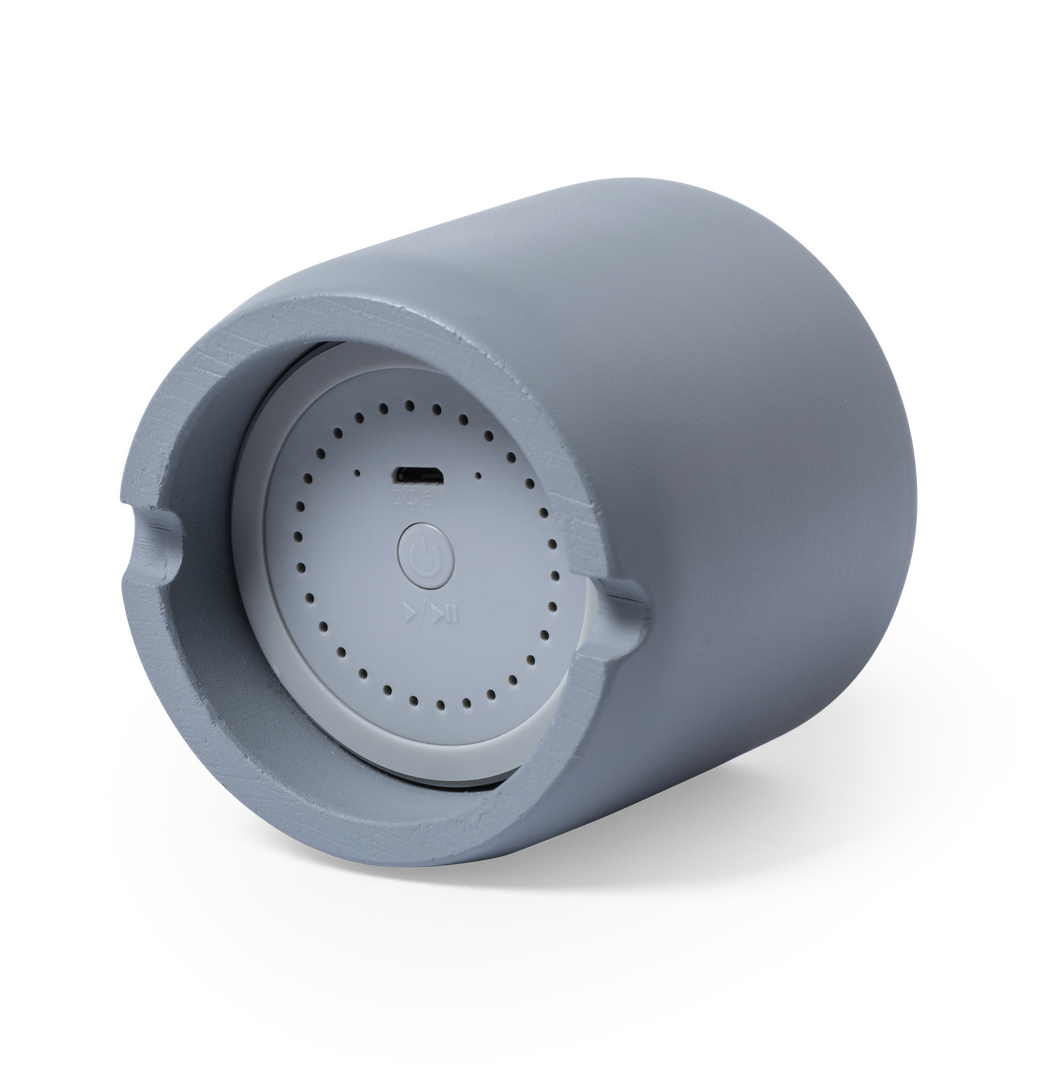 Altavoz Bluetooth en combinación de piezas de bambú de corte nature y cemento de piedra caliza, un conglomerante formado por la mezcla de materiales naturales, principalmente piedra caliza molida y agua, obteniendo un material de gran consistencia y durab Conexión Bluetooth. Potencia 3W. Recargable USB. Cable Incluido