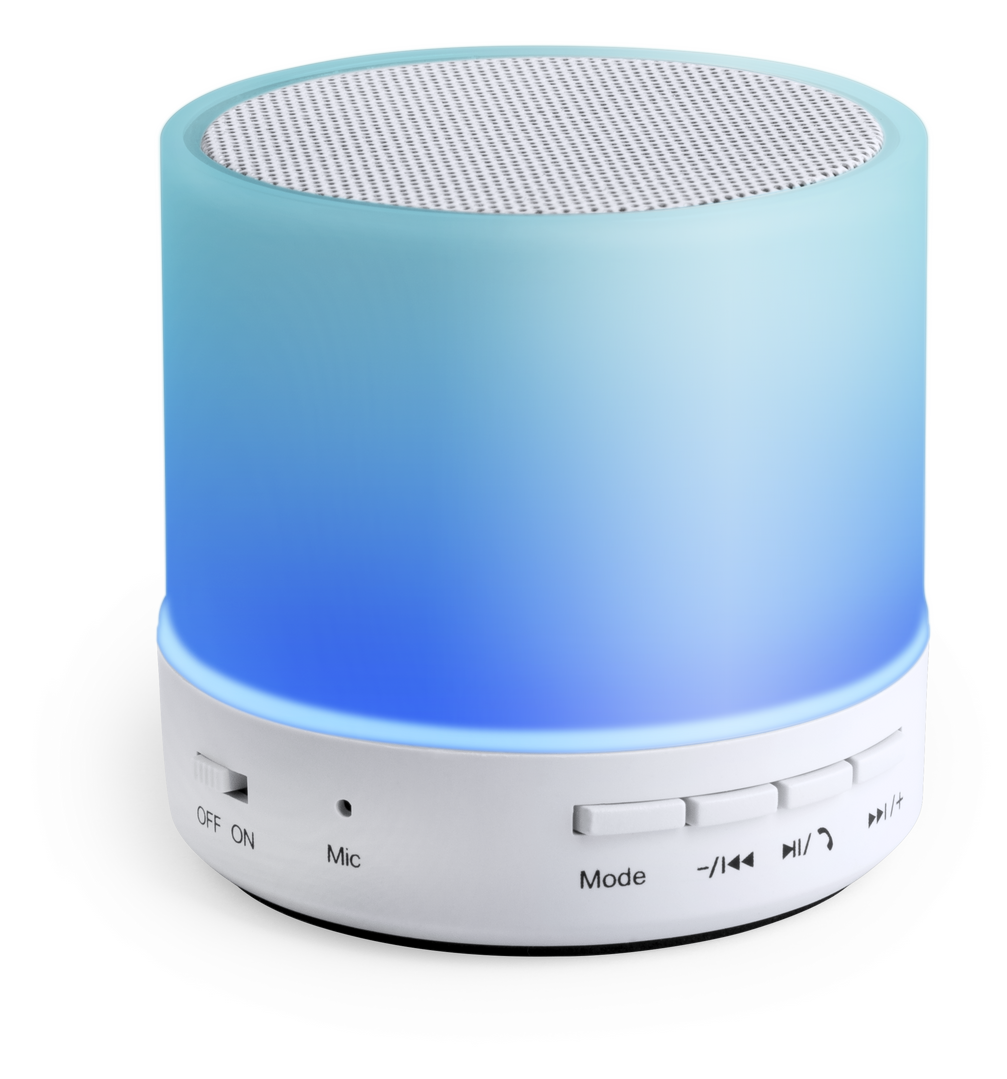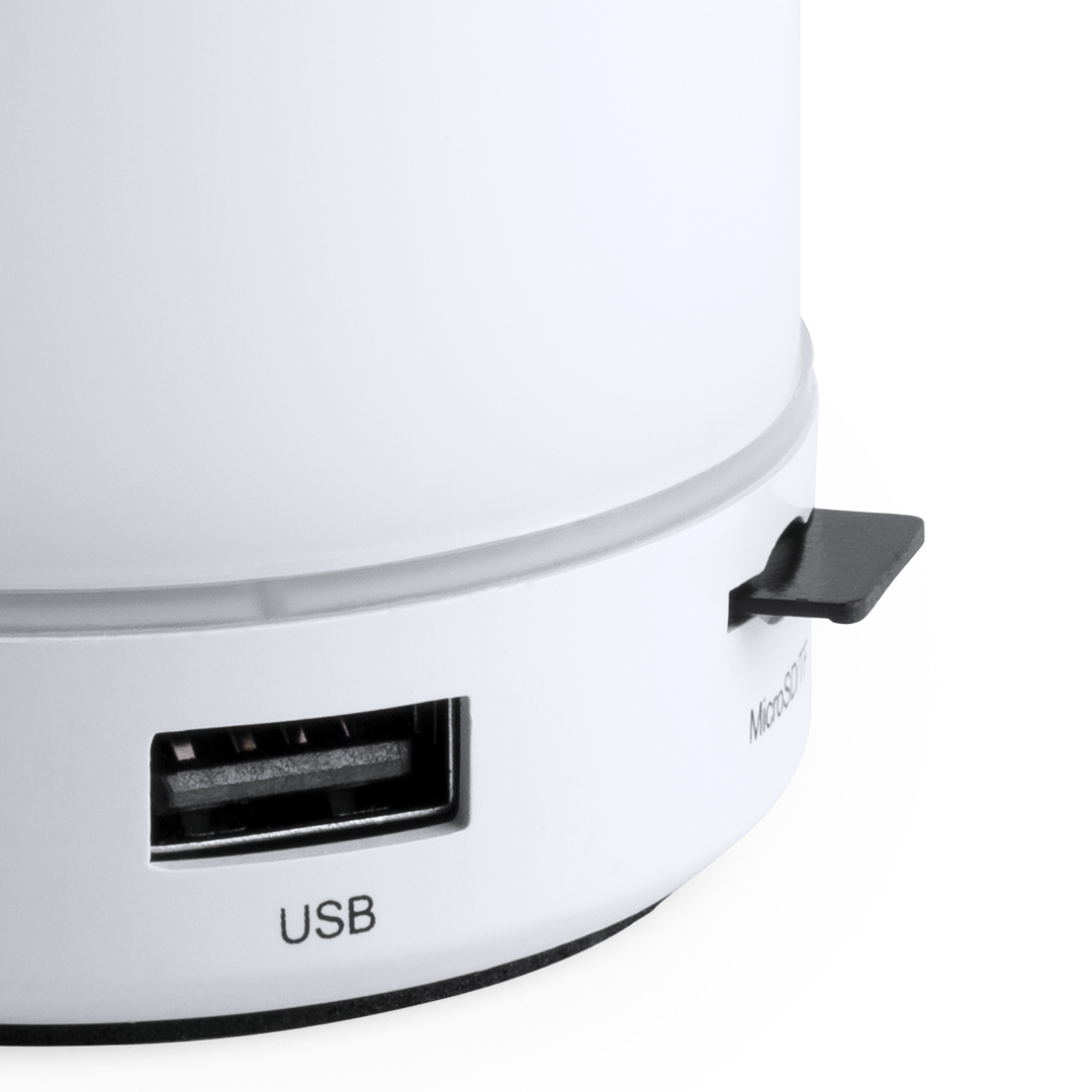 Altavoz de Tecnología Led Inteligente y conexión Bluetooth®. 3W de potencia, con ranura USB para reproducir música desde unidad externa y función manos libres. Ranura para tarjetas micro SD de hasta 32 GB de capacidad, entrada auxiliar de línea mediante c Led Inteligente. 3 Posiciones de Luz. Conexión Bluetooth. Potencia 3W. Recargable USB. Cable Incluido