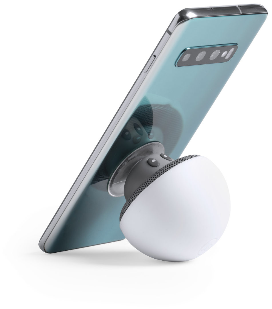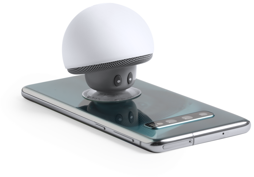 Altavoz de original diseño seta con función soporte para móvil. Conectividad Bluetooth® 5.0, con 3W de potencia y función manos libres. Cuerpo con suave acabado de tacto goma y ventosa de fijación para función soporte. Cable micro USB incluido y presentad Conexión Bluetooth. Potencia 3W. Recargable USB. Cable Incluido