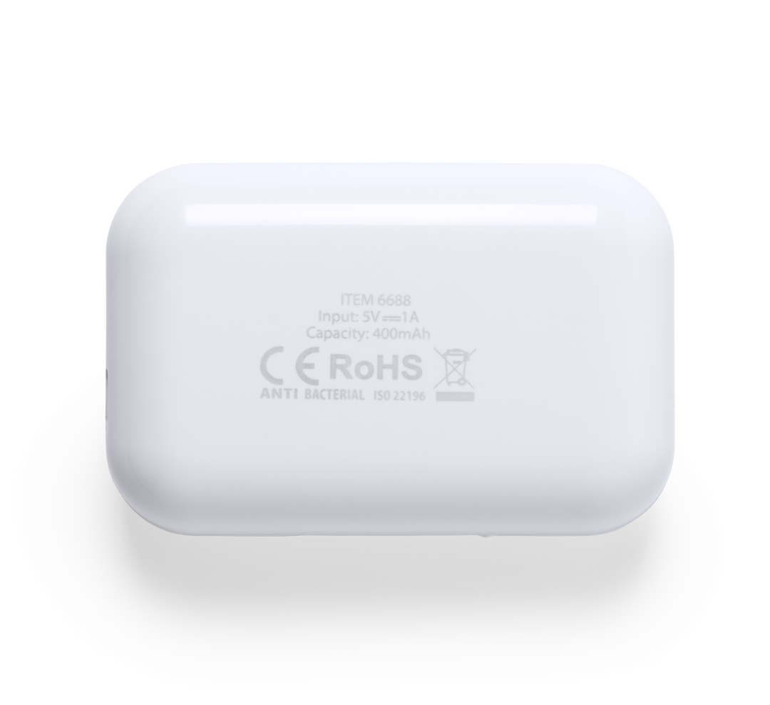 Auriculares antibacterianos intraurales en elegante acabado blanco y conexión Bluetooth® 5.0. Fabricados en resistente material ABS brillo y de diseño ergonómico, incluyen botón de control táctil integrado en el auricular, con base de carga a juego. Funci Conexión Bluetooth. Recargable USB. Cable Incluido