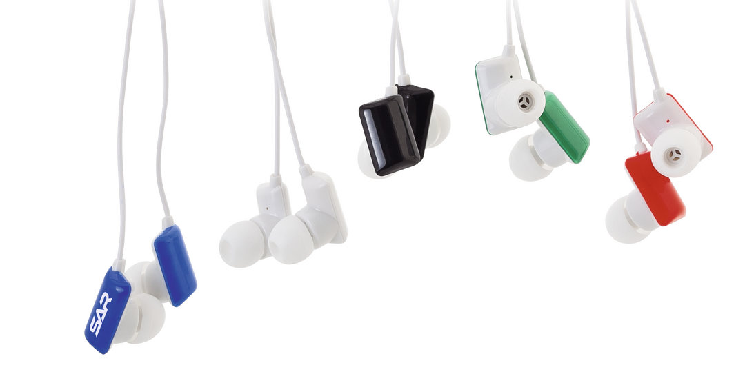 Auriculares intraurales de diseño bicolor, conexión jack de 3,5mm y cable en color blanco. Con pastillas rectangulares diseñadas para marcaje en tampografía y presentados en estuche individual de cartón. Conexión Jack 3,5 mm