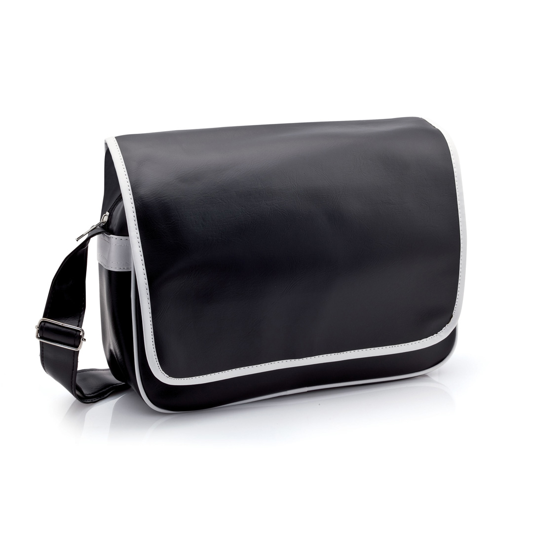 Bandolera de diseño urbano en resistente PVC con elegante combinación bicolor de ribete y cuerpo. Con cierre de solapa de velcro, bolsillo interior con cremallera a juego, bolsillo frontal y cinta bandolera a juego ajustable.