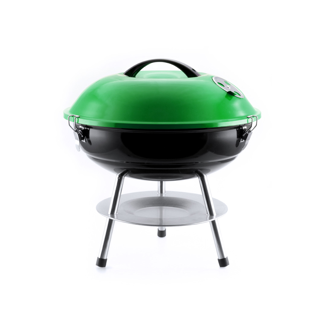 VerdeBarbacoa en resistente acero con base en color negra y tapa en vivos colores. Tapa con cómoda asa y orificios de ventilación, parrilla metálica, plato antigoteo y pies antideslizantes. Presentada en atractiva caja de diseño.