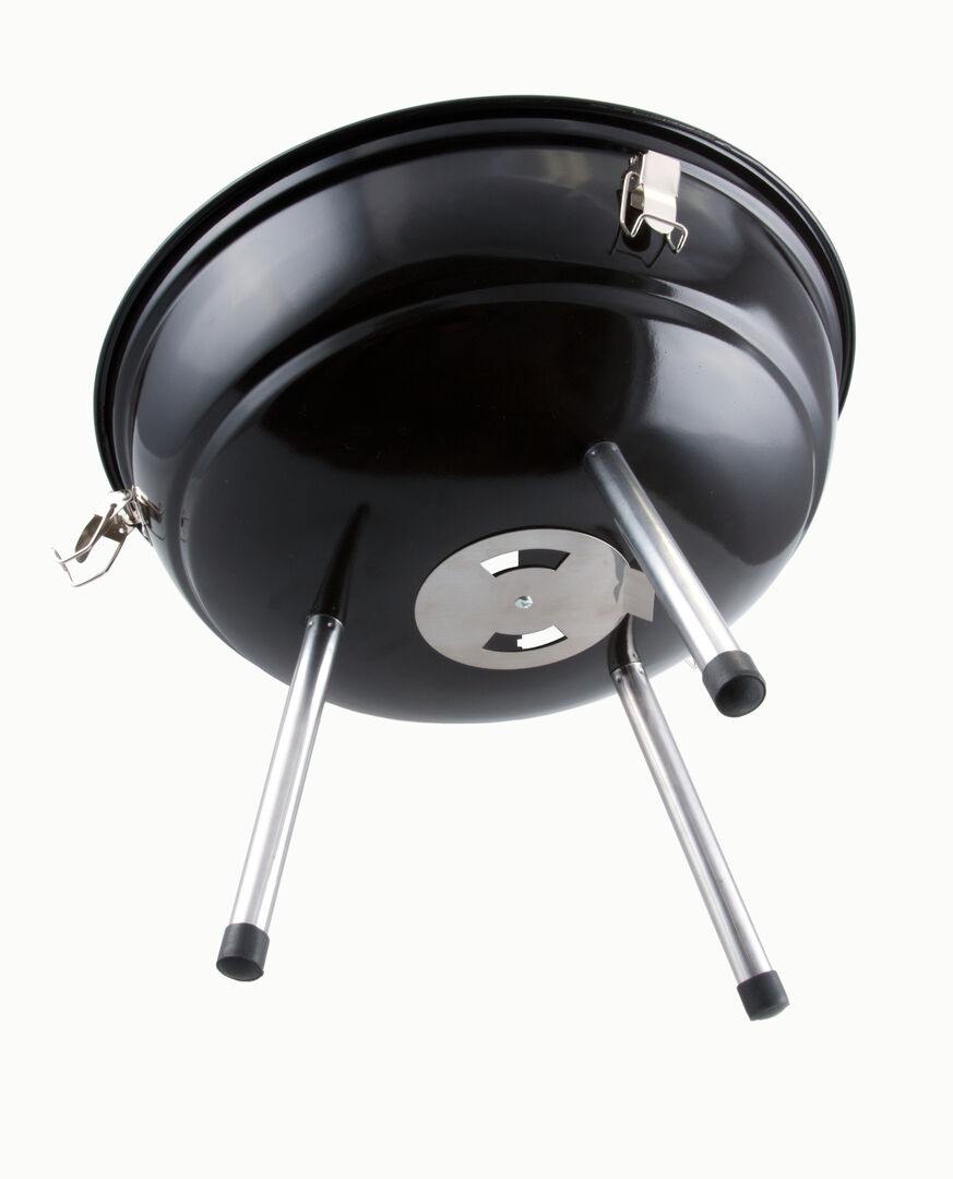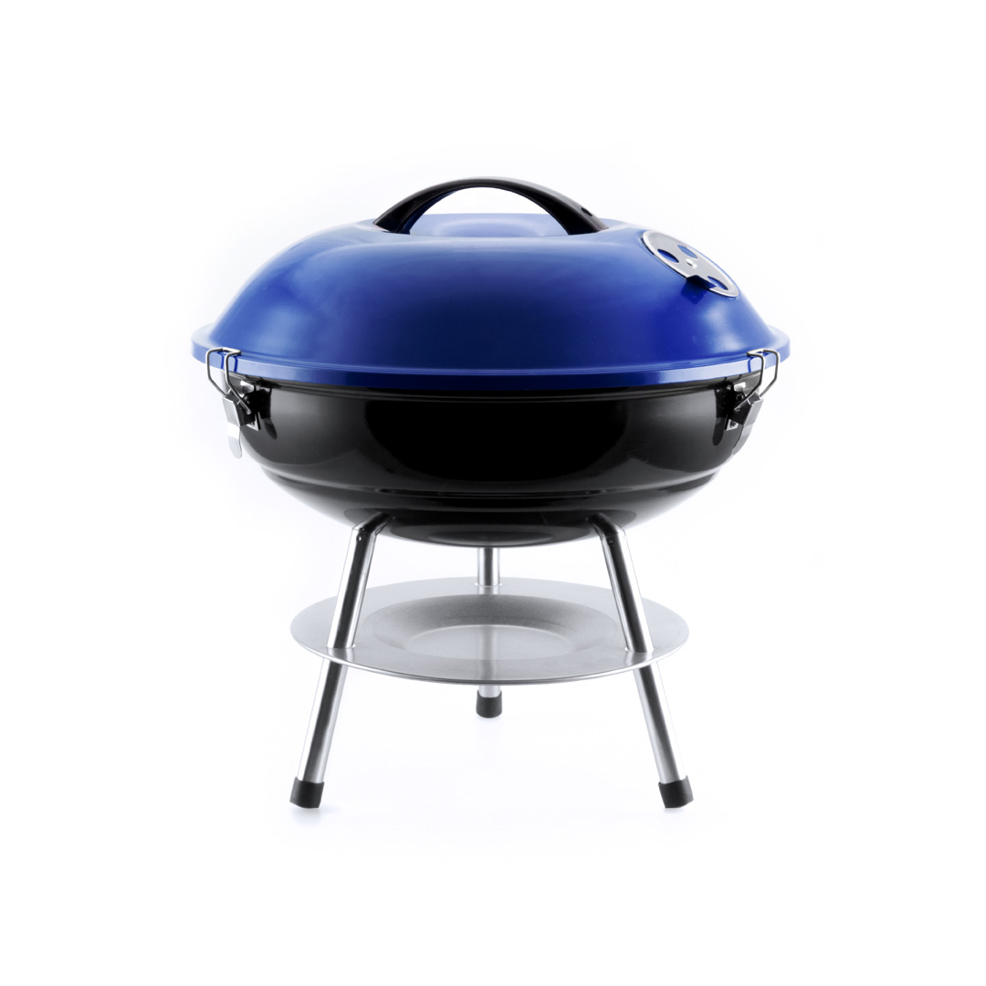 Barbacoa en resistente acero con base en color negra y tapa en vivos colores. Tapa con cómoda asa y orificios de ventilación, parrilla metálica, plato antigoteo y pies antideslizantes. Presentada en atractiva caja de diseño.