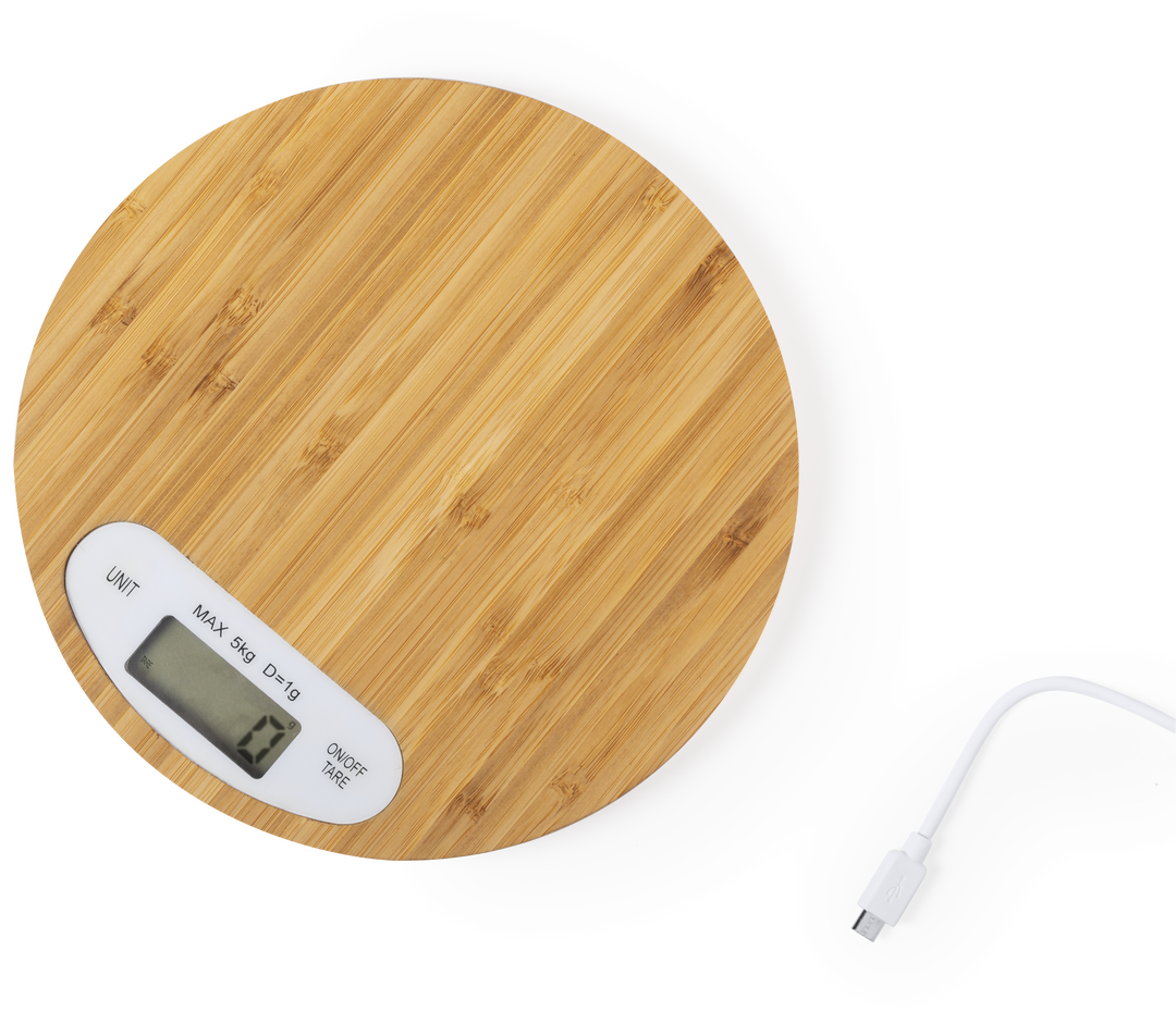 Báscula de cocina de línea nature en bambú pulido. Display digital, con funciones de apagado automático, tara y selección de unidad de pesaje. Alimentación a pilas (de botón incluidas) y peso máximo 5kg. Presentada en atractiva caja de diseño eco. Pila Botón Incluida
