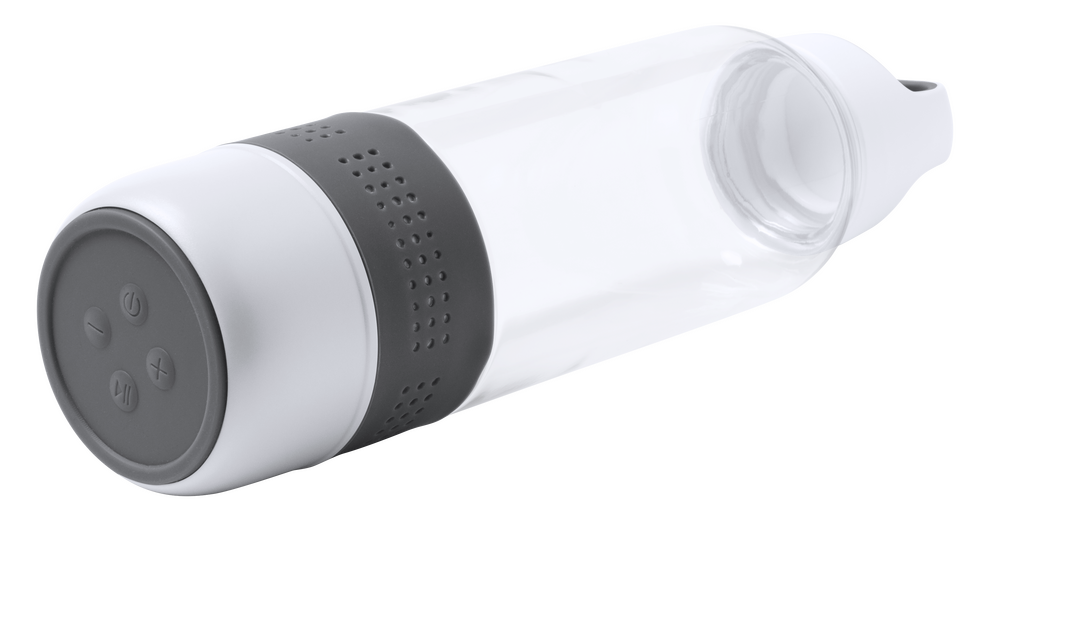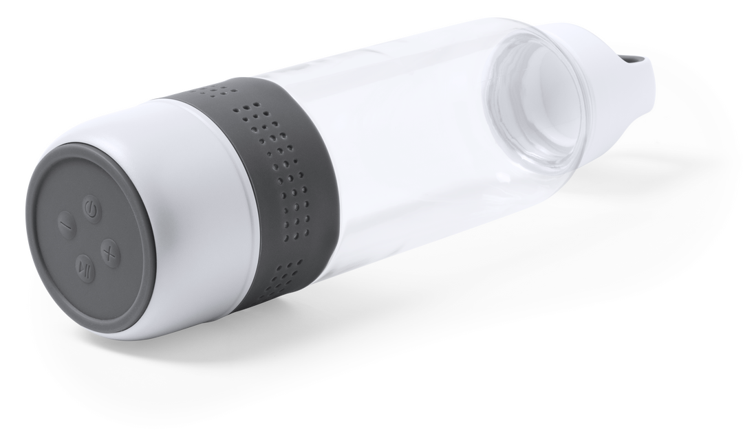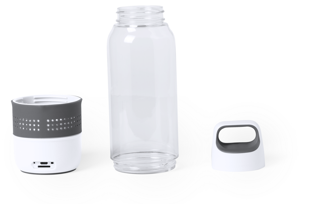 Bidón de 500ml de capacidad con altavoz bluetooth integrado en base. Cuerpo acabado en material tritán de resistencia al calor (70º) y libre de BPA en color transparente, con tapón de seguridad a rosca y asa integrada. Base altavoz de conexión bluetooth d 500 ml. Conexión Bluetooth. Potencia 3W. Recargable USB. Presentación Individual. Cable Incluido