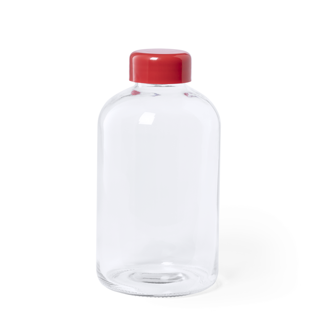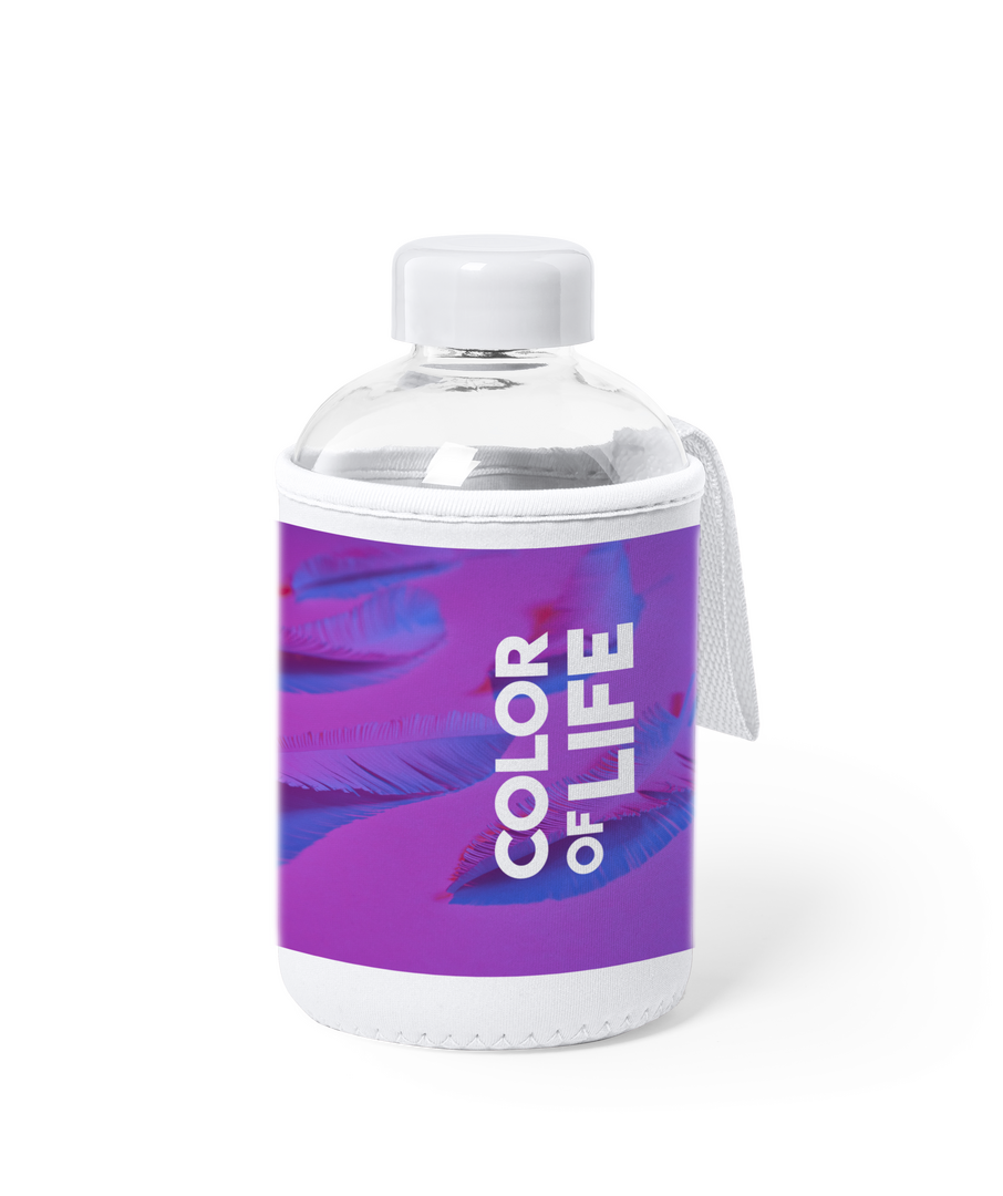 Bidón de 600ml de capacidad. Fabricado con cuerpo de cristal y tapón a rosca. Incluye funda de soft shell a juego, con asa de transporte. Disponible en variada gama de colores, y viene presentado en caja individual de atractivo diseño. 600 ml. Presentación Individual. Funda Soft Shell Incluida