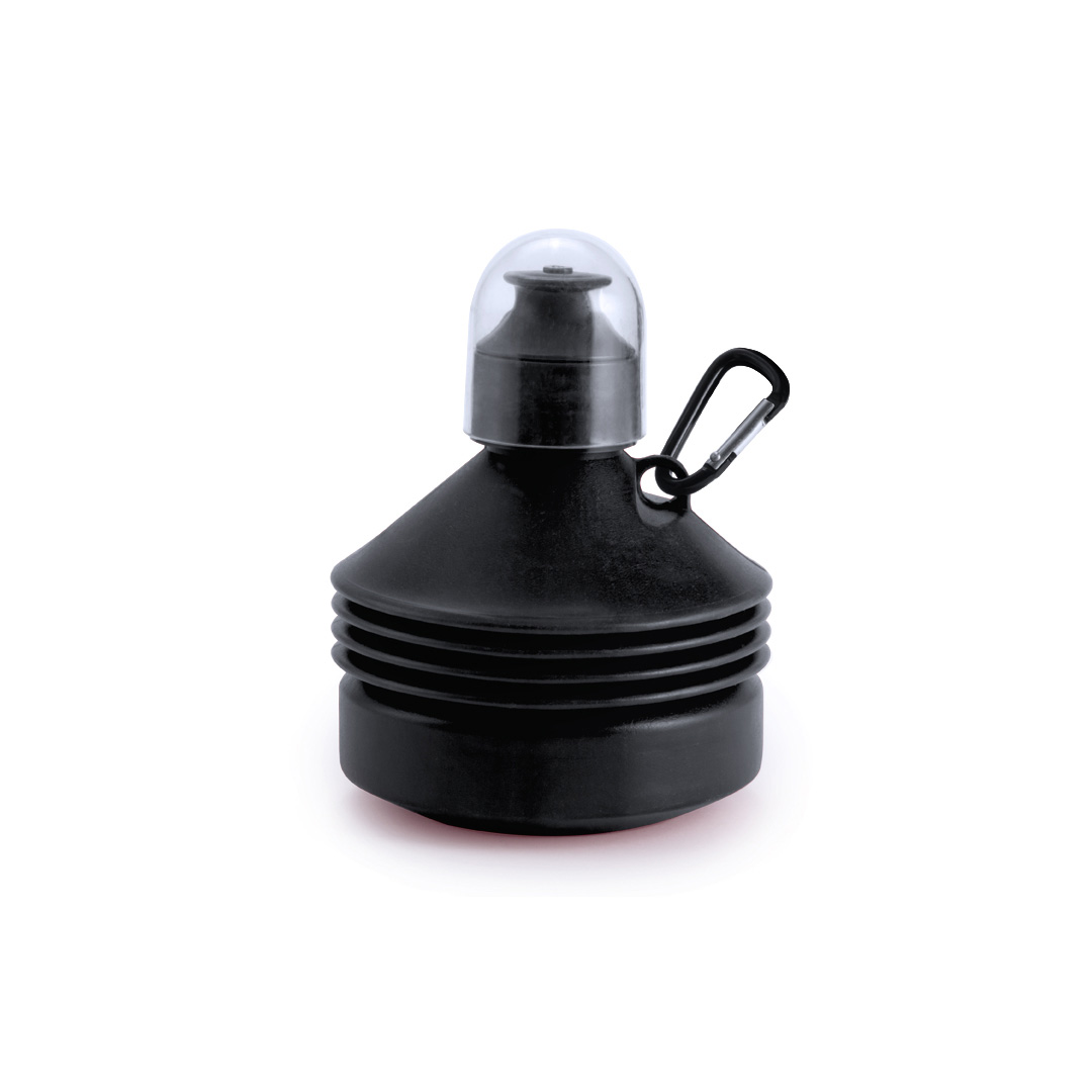 Bidón plegable de 570ml de capacidad con cuerpo ergonómico acabado en PE de vivos y variados colores. Dosificador de seguridad con capucha de cierre y mosquetón metálico de transporte. 570 ml