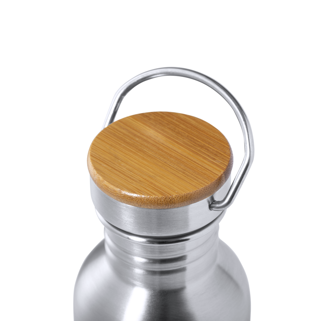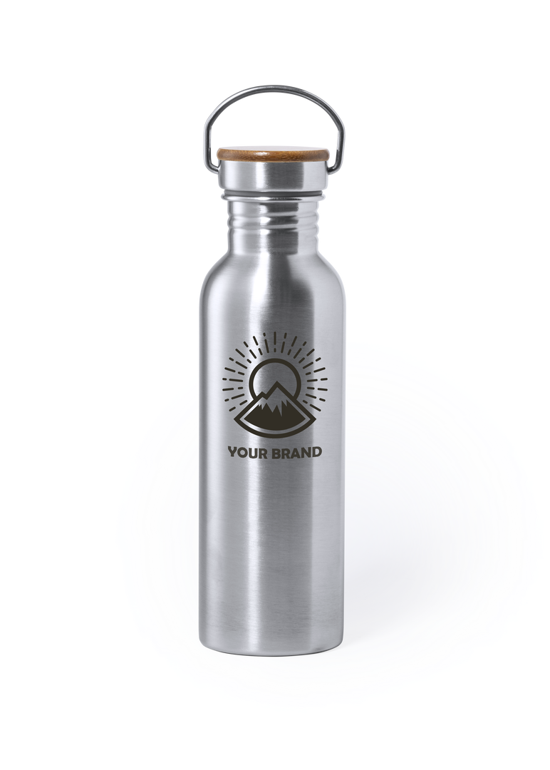 Bidón de línea nature y 800ml de capacidad. Cuerpo fabricado en acero inox y tapón en bambú con original asa metálica de transporte. Presentado en atractiva caja de diseño eco. 800 ml. Presentación Individual