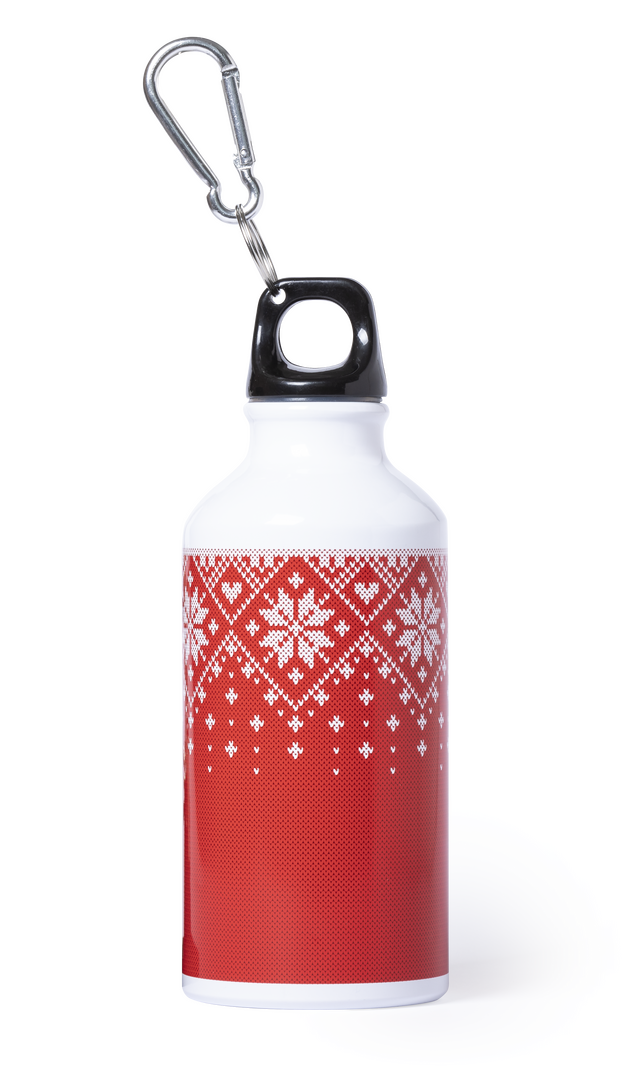 Bidón de 400ml de capacidad con cuerpo de acabado aluminio, en diseño bicolor de navidad. Con tapón de seguridad a rosca y mosquetón metálico de transporte. Presentado en atractiva caja de diseño. 400 ml. Presentación Individual