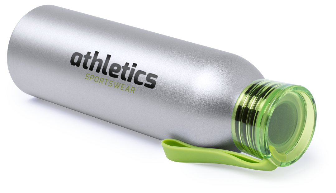 Bidon de aluminio de 650 ml de capacidad. Cuerpo en color plateado, con tapón de seguridad a rosca en variada gama de colores transparentes. Cinta de transporte en material TPR a juego. 650 ml