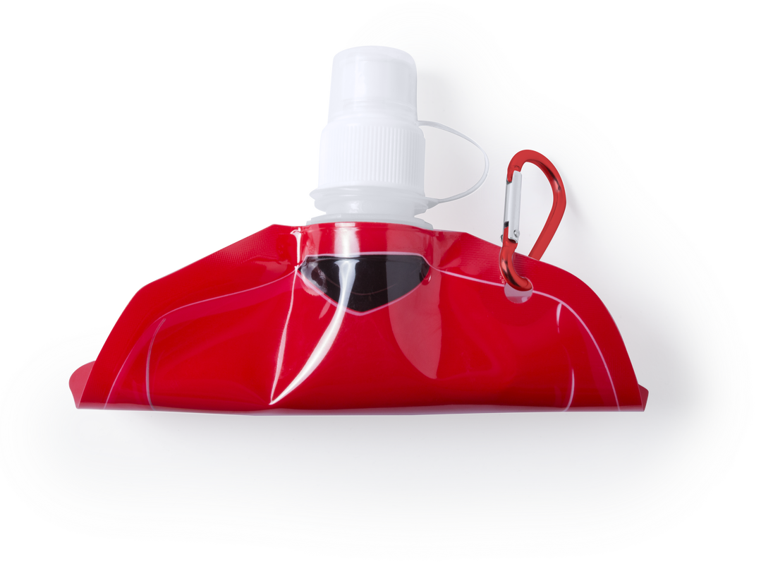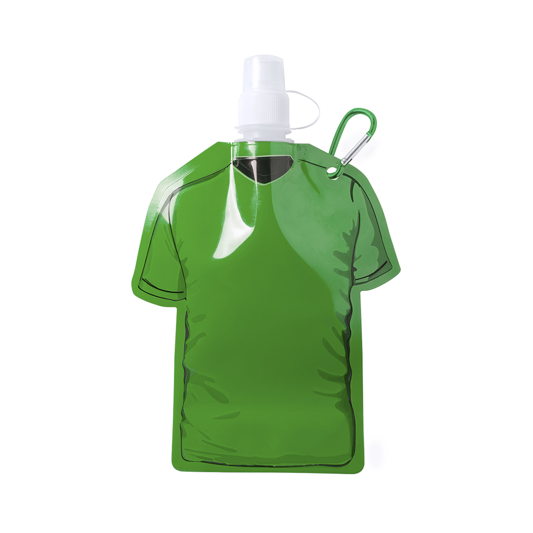 Bidón camiseta de 470ml de capacidad con cuerpo flexible de acabado en PET de variados y vivos colores. Con tapón de seguridad a rosca con capucha de cierre y mosquetón metálico de transporte a juego. 470 ml