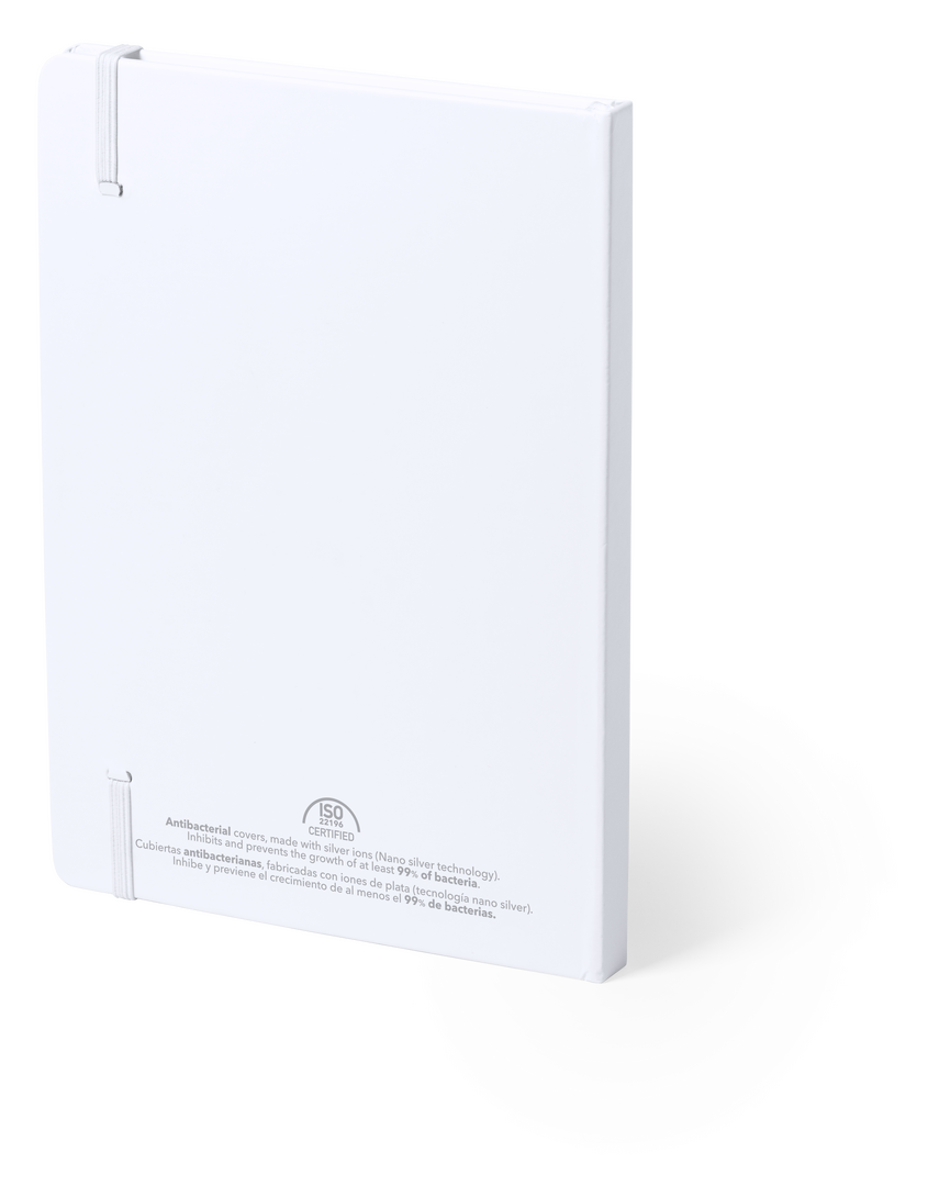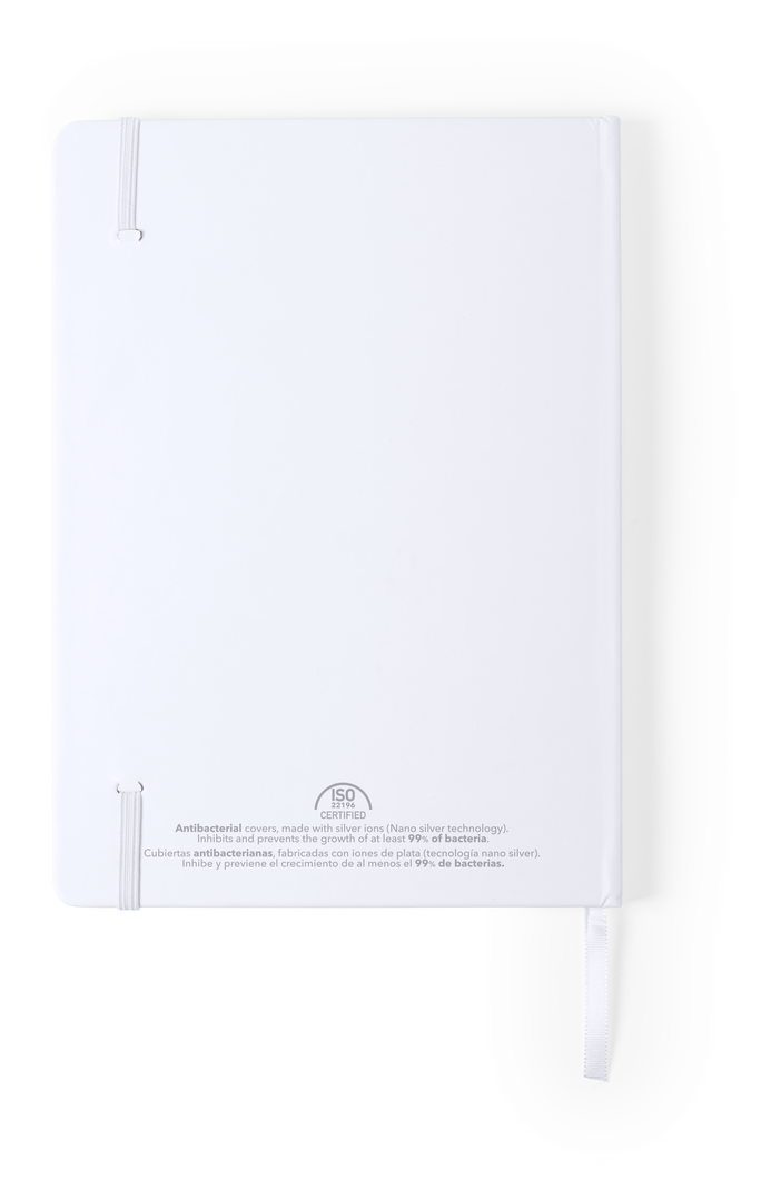 Bloc de notas tamaño A5 con tapas antibacterianas rígidas de cartón laminado. En elegante acabado blanco mate y encuadernación cosida. Cubiertas antibacterianas, fabricadas con agentes activos a base de plata, que inhiben y previenen el crecimiento de al Portada Rígida. 80 Hojas