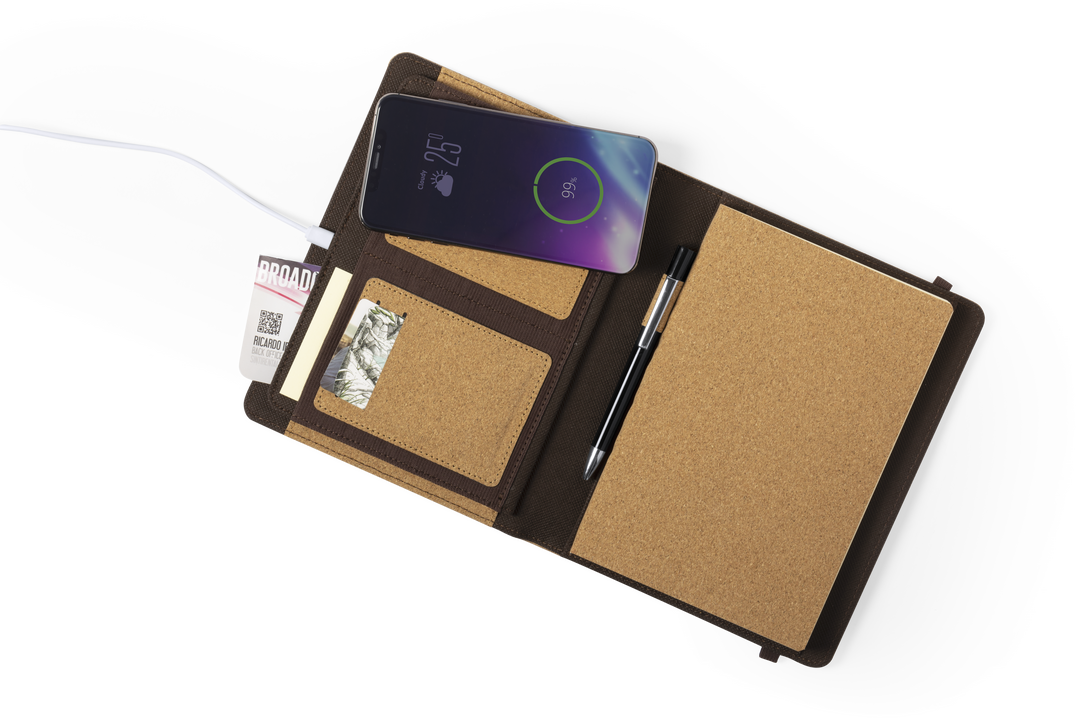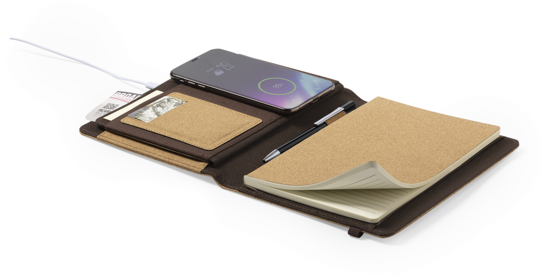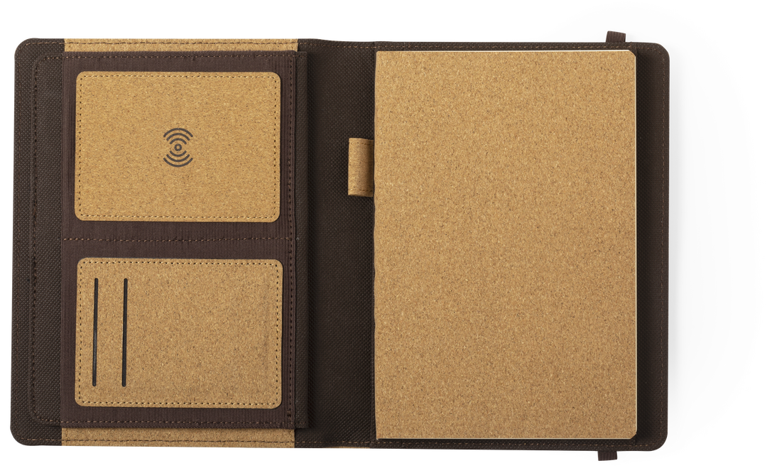 Bloc de notas de línea nature con cargador inalámbrico integrado. Cubiertas en corcho natural, de sobrio diseño y con original estación de carga en la contraportada. Compatible con dispositivos equipados con tecnología de carga inalámbrica. Bloc de 64 hoj Inalámbrico. 64 Hojas. Cable Incluido
