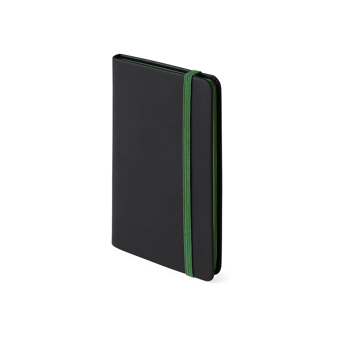 VerdeBloc de notas con tapas de suave tacto acabadas en elegante polipiel negra. De 80 hojas lisas con lomo en divertidos colores, elástico de sujeción y marcapáginas de tela a juego. Portada Rígida. 80 Hojas