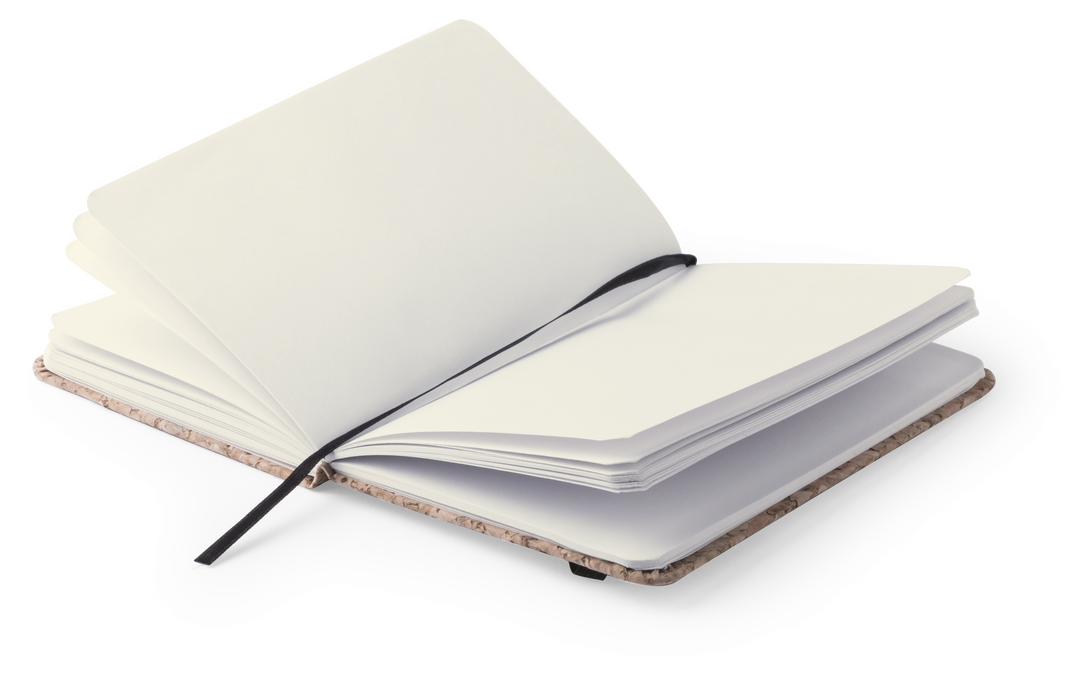 Bloc de notas con tapas de suave tacto acabadas en corcho natural. De 80 hojas lisas, con elástico de sujeción y marcapáginas de tela a juego. Portada Rígida. 80 Hojas