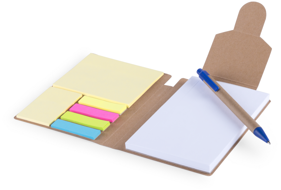 Bloc de notas adhesivas con bolígrafo de cartón reciclado a juego incluido. De original diseño bicolor, tapas de suave tacto con autocierre de tira en parte superior a juego y acabadas en resistente cartón reciclado rígido. Con soporte para el bolígrafo i Bloc 70 Hojas. 25 Notas Adhesivas 7,6 x 9 cm. 25 Notas Adhesivas 3,8 x 6 cm. 100 Mininotas Adhesivas 1,2 x 4,8 cm. Bolígrafo Cartón Reciclado Incluido