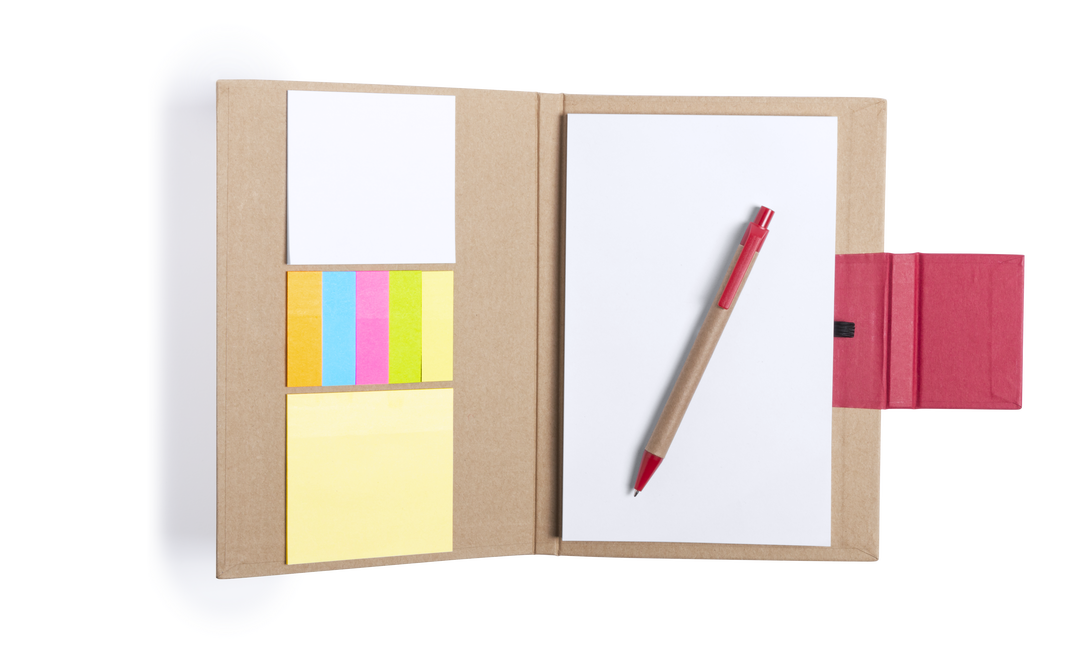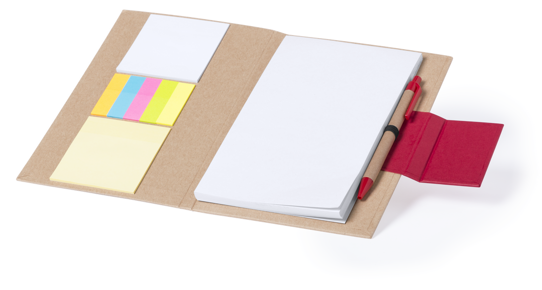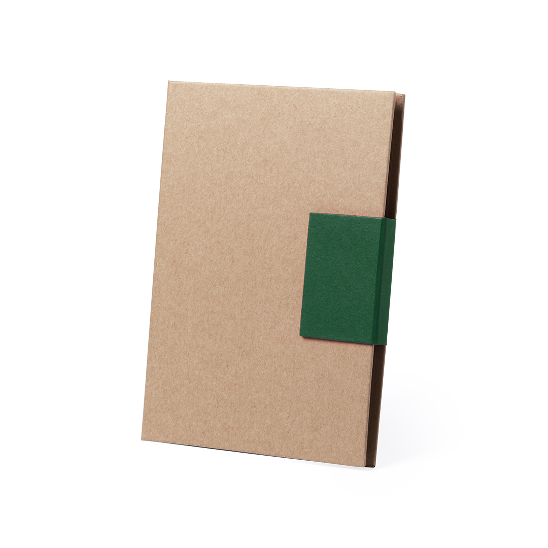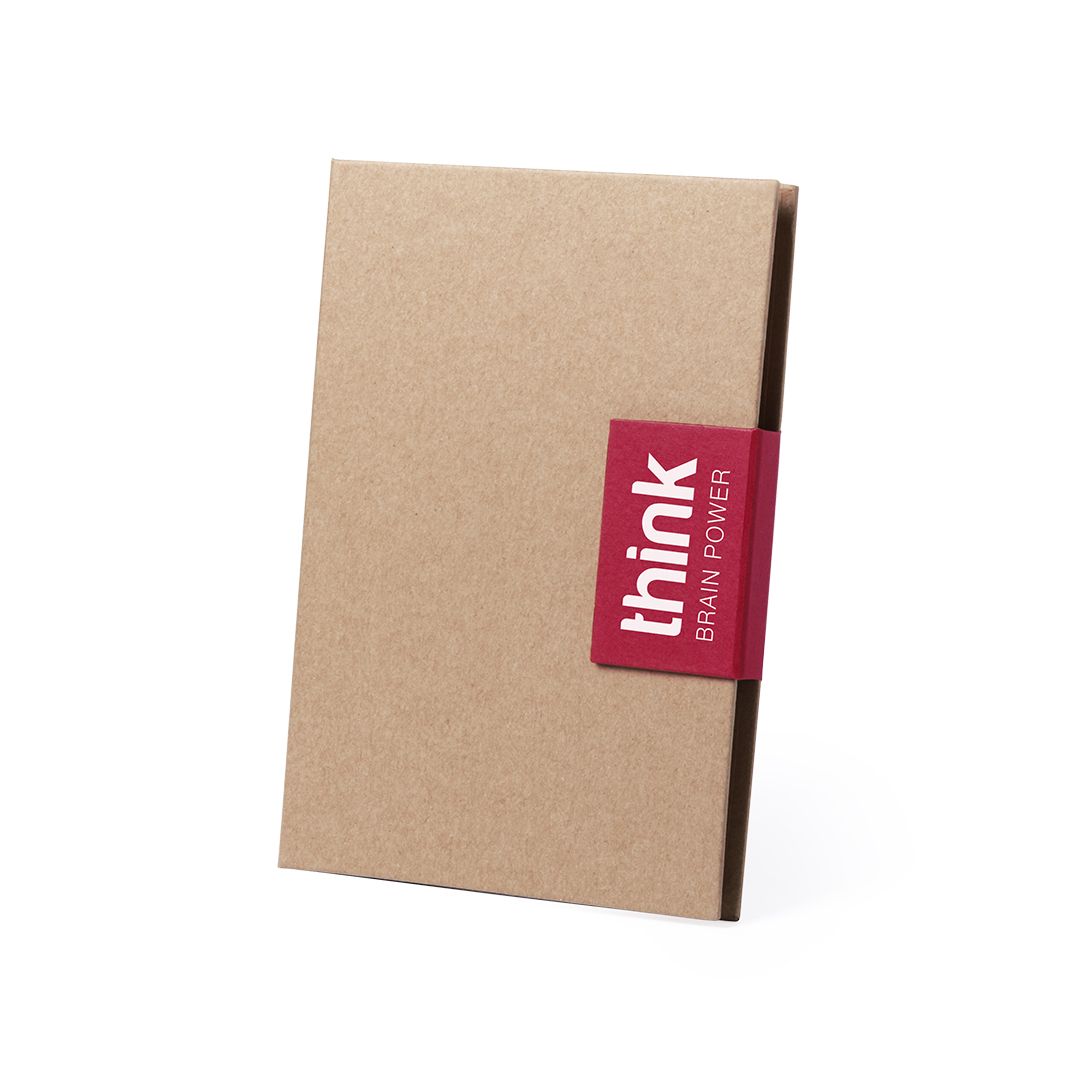 Original bloc de notas adhesivas con bolígrafo de cartón reciclado incluido y original cierre de solapa en vivos colores. Tapas de suave tacto acabadas en resistente cartón reciclado rígido. Con bloc de 50 hojas lisas, 30 notas adhesivas grandes, y 75 min Bloc 50 Hojas. 30 Notas Adhesivas 7,3 x 7,5 cm. 75 Mininotas Adhesivas 1,5 x 5 cm. Bolígrafo Cartón Reciclado Incluido.
