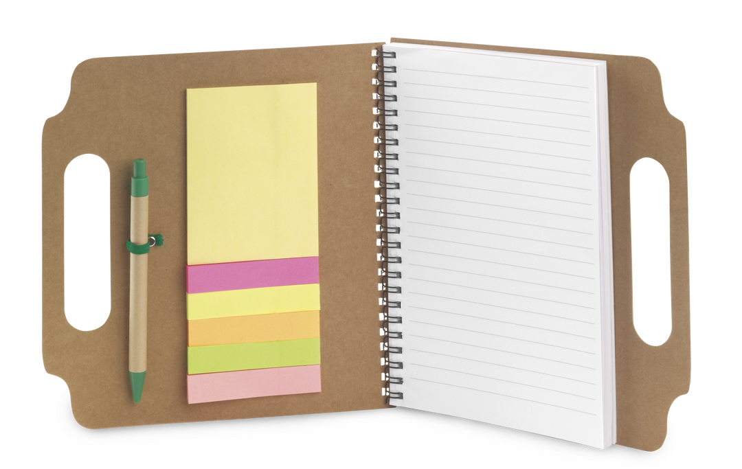 Bloc de notas adhesivas de anillas con bolígrafo de cartón reciclado incluido. De original diseño, con asas de transporte troqueladas y tapas de suave tacto acabadas en resistente cartón reciclado rígido. Con soporte para bolígrafo integrado, incluye bloc Bloc 70 Hojas. 25 Notas Adhesivas 7,5 x 10 cm. 125 Mininotas Adhesivas 1,5 x 7,5 cm. Bolígrafo Cartón Reciclado Incluido