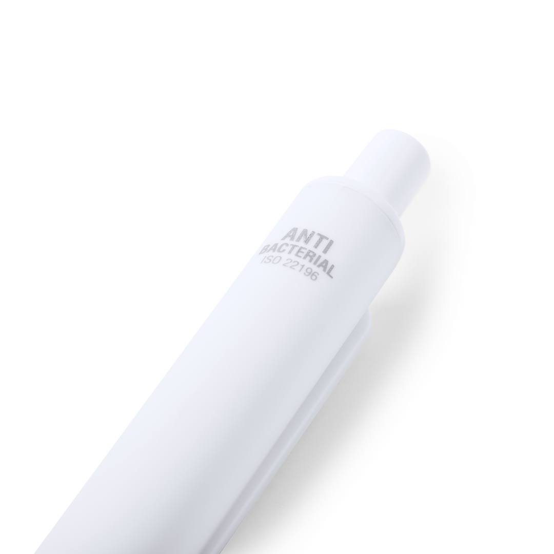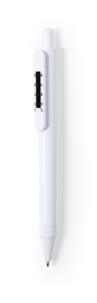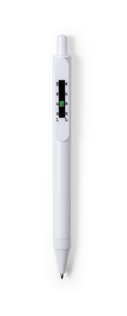 Bolígrafo antibacteriano de mecanismo pulsador con termómetro integrado en clip. Diseño monocromático, especialmente diseñado para marcaje en tampografía. En tinta azul y presentado en bolsa individual de diseño. Los productos con tratamientos antibacter Función Termómetro
