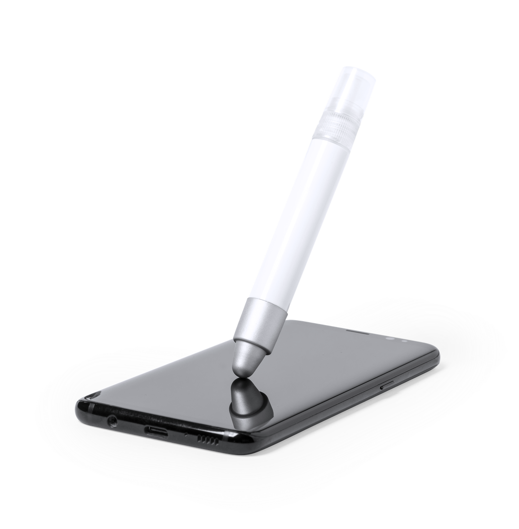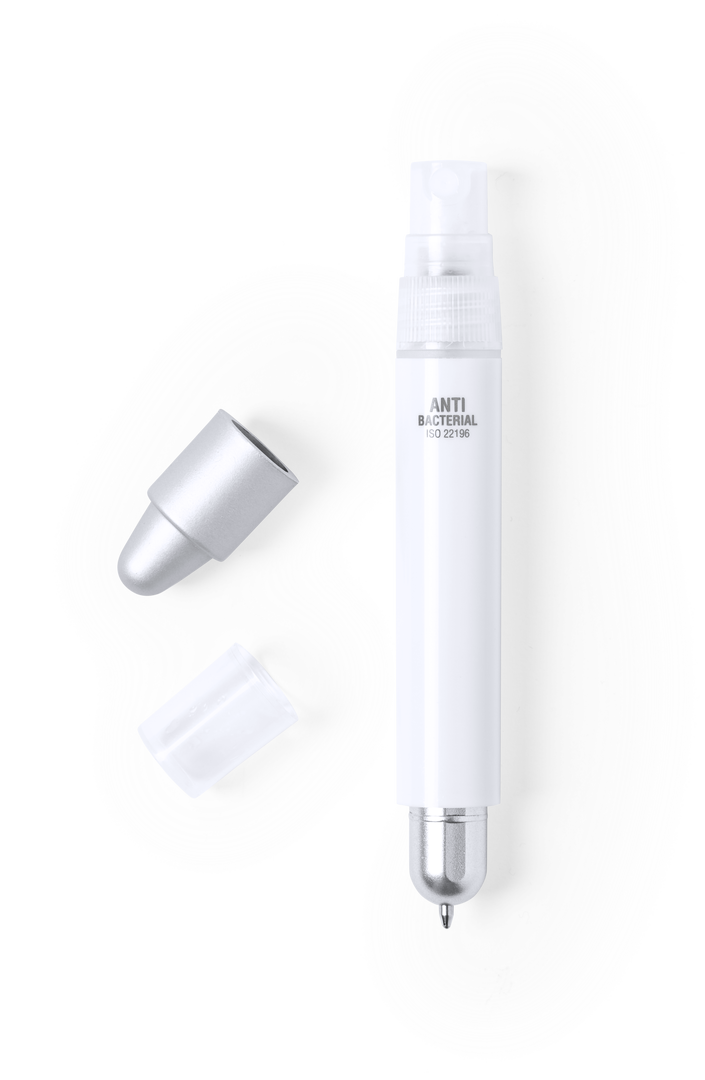 Bolígrafo antibacteriano con pulverizador recargable integrado y capucha protectora con puntero en color gris. Acabado liso en resistente ABS brillante con detalles cromados y escritura en tinta azul. Capacidad del pulverizador 3ml. Líquido no incluido. 3 ml. Rellenable. Líquido No Incluido