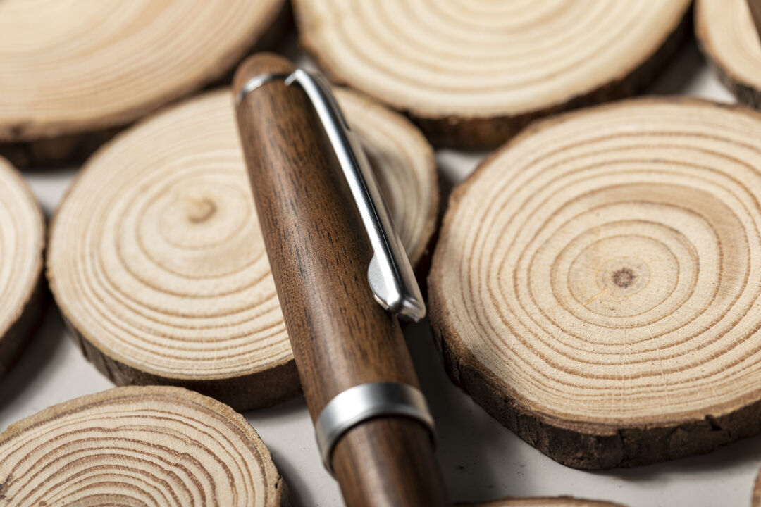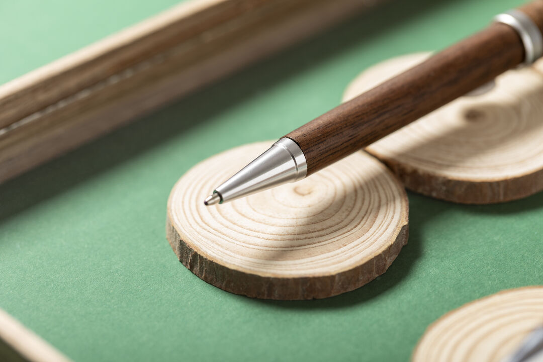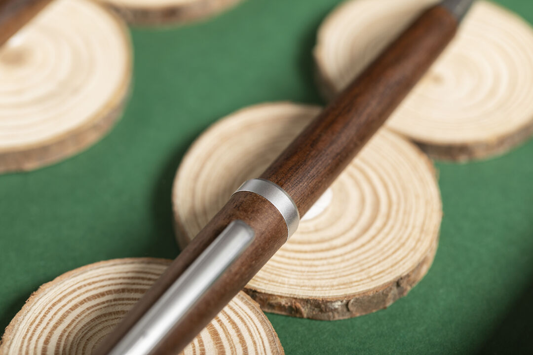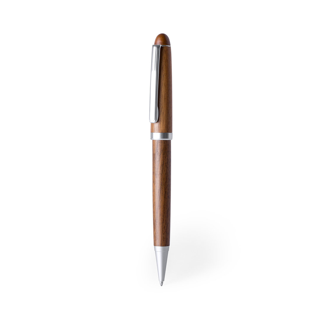 Bolígrafo de línea nature con cuerpo en madera de nogal. De mecanismo giratorio, con clip y detalles en acabado cromado. Tinta azul.