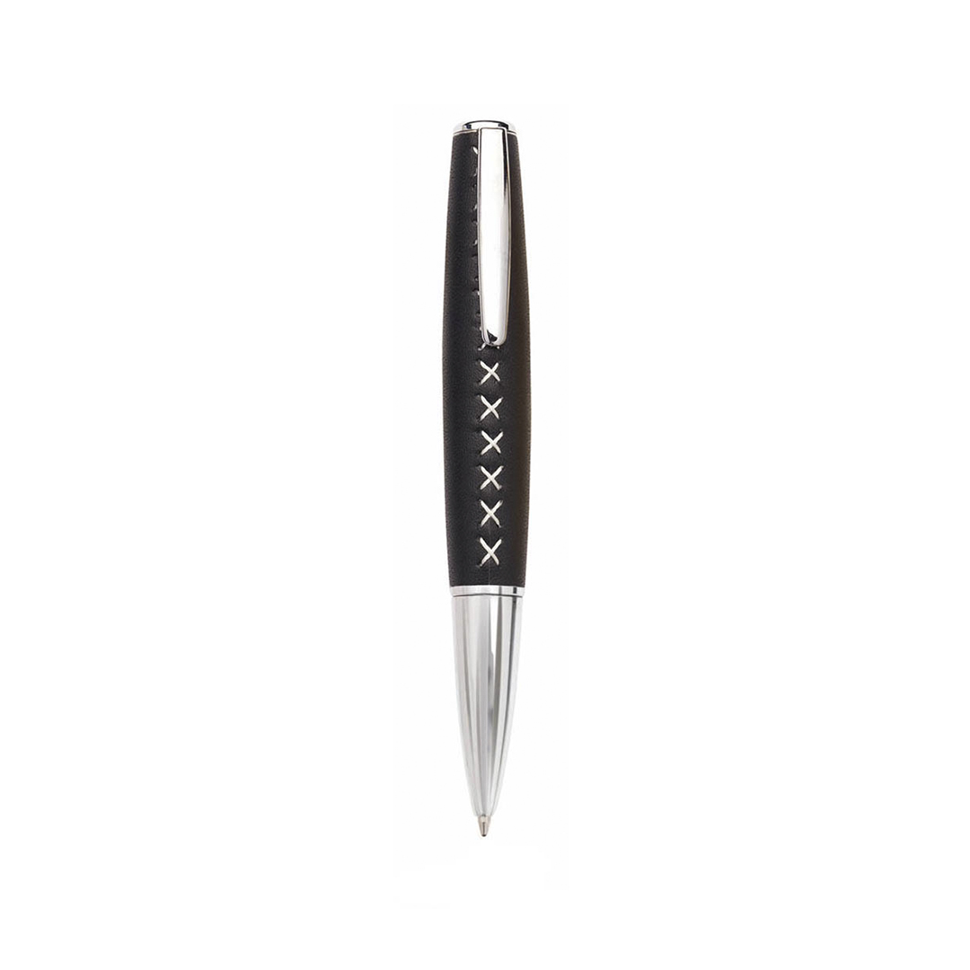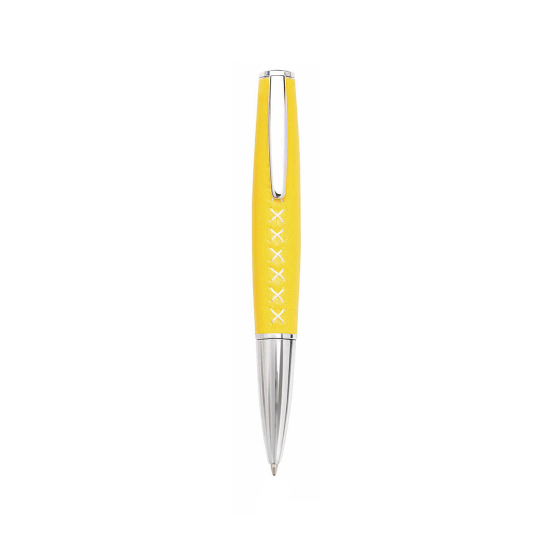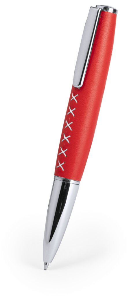 Bolígrafo de original diseño en suave combinación de polipiel y metal. En vivos colores, con accesorios de costura en X y con clip y puntero a juego en plateado. Tinta azul.