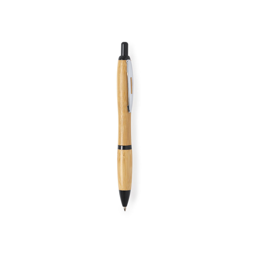 Bolígrafo con mecanismo pulsador de línea nature, con cuerpo en bambú y detalles en variada gama de colores. Con original clip metálico troquelado y cómoda empuñadura de bambú. Tinta azul.