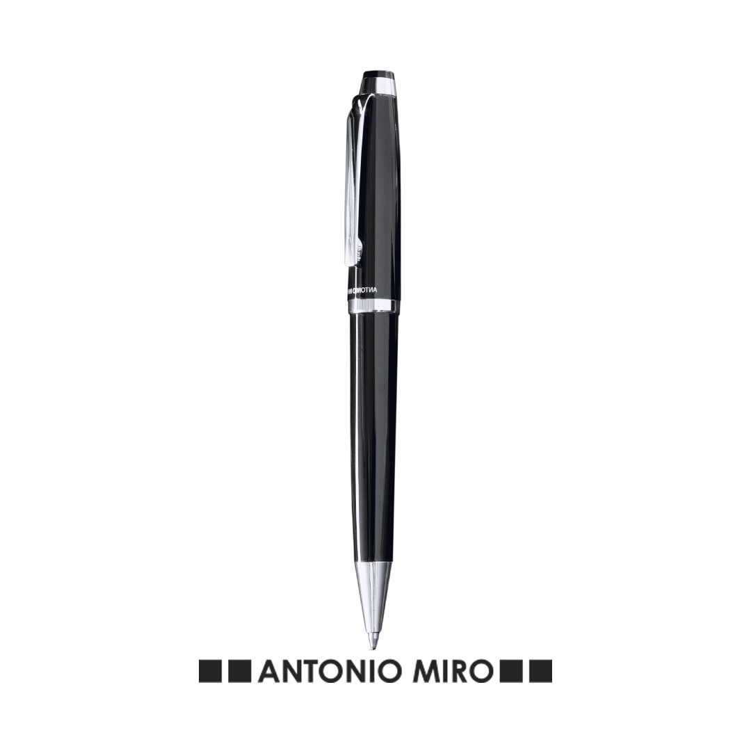 Bolígrafo de Antonio Miró en elegante diseño bicolor y suave cuerpo metálico en sobrio color negro. Con logotipo de la marca encima de la anilla, clip y punta en acabado plateado brillante. Presentado en estuche individual en color negro con logotipo de l Carga Jumbo