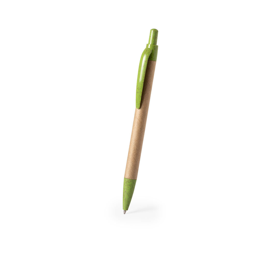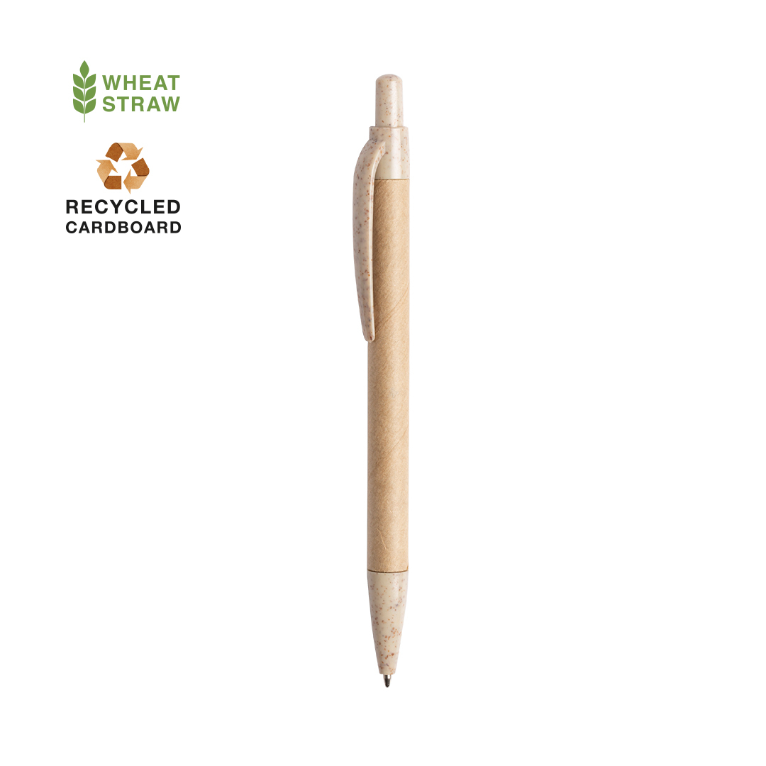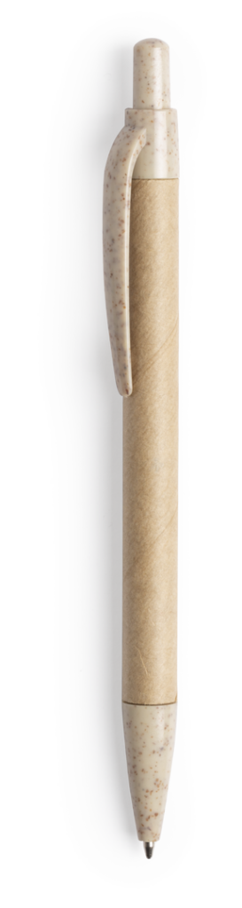 Bolígrafo de línea nature con cuerpo en cartón reciclado. Clip, punta y pulsador en caña de trigo, para así fomentar la utilización de materias primas naturales y reducir las emisiones contaminantes. De mecanismo pulsador y con tinta azul. Disponible en c