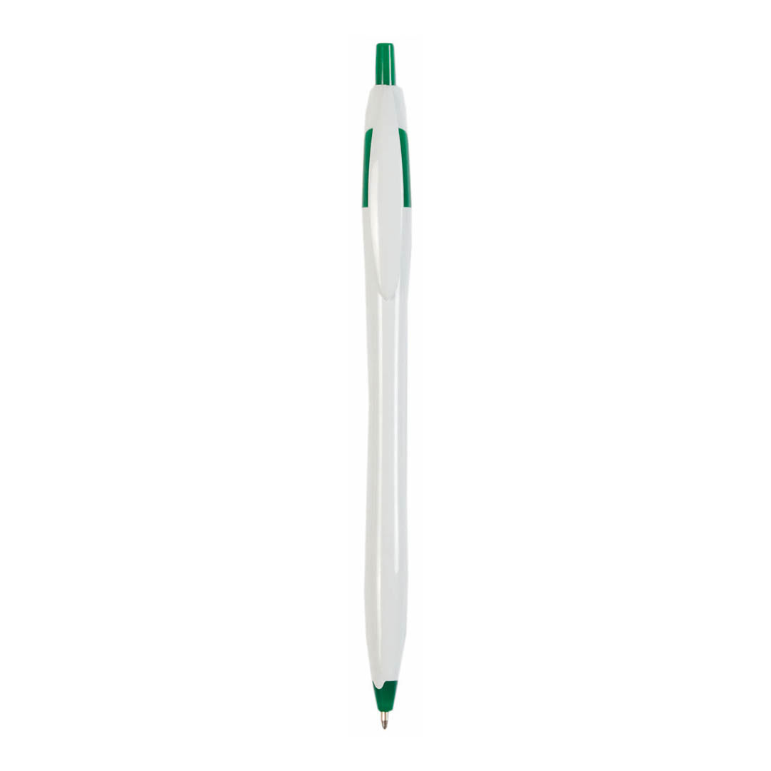 VerdeBolígrafo de mecanismo pulsador de atrevido diseño bicolor y cuerpo curvado, de suave acabado en divertidos colores sólidos. Con clip plano a juego. Tinta azul.