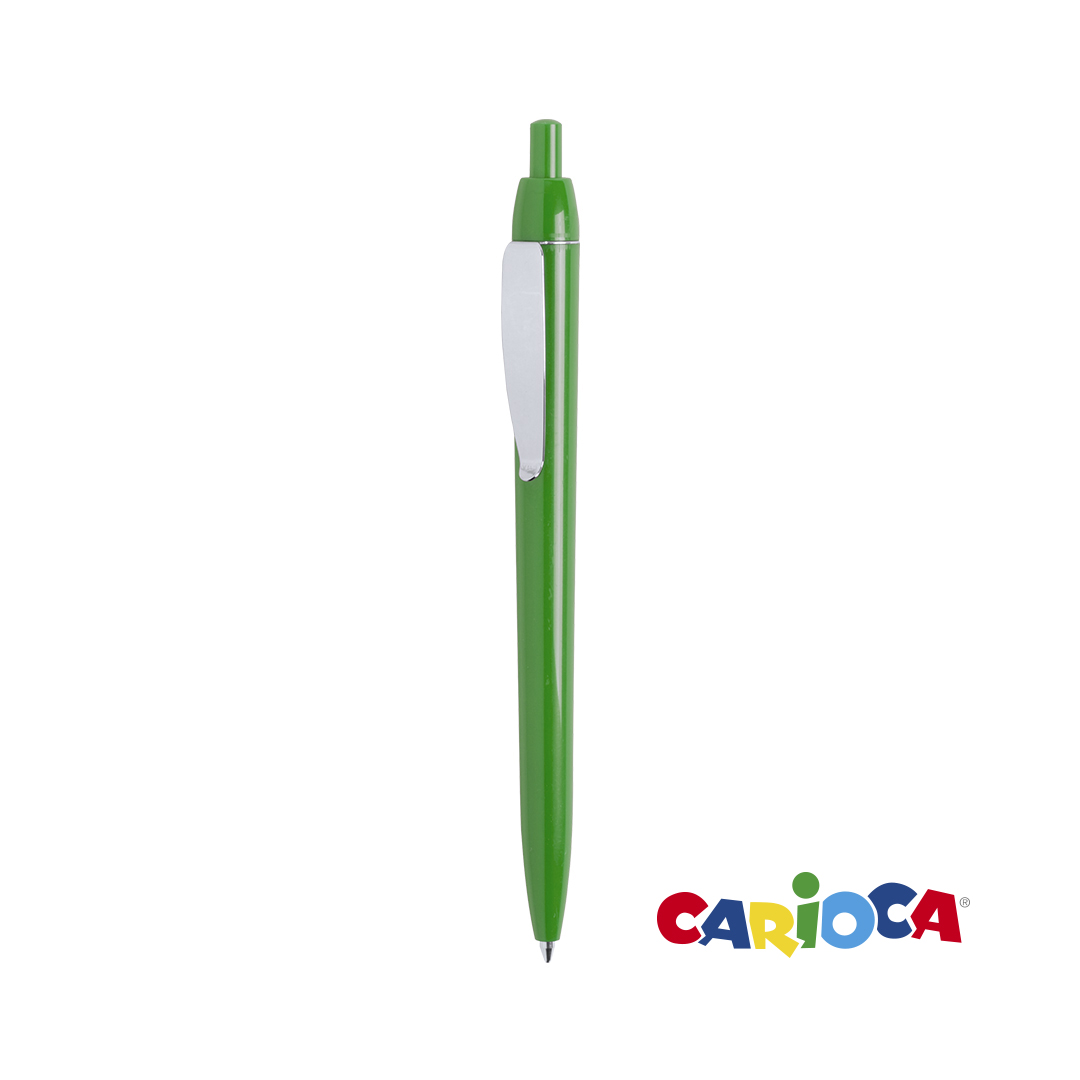 Bolígrafo Glamour de Carioca, con mecanismo pulsador y suave cuerpo acabado en variada gama de vivos colores. Con Clip metálico y tinta azul.