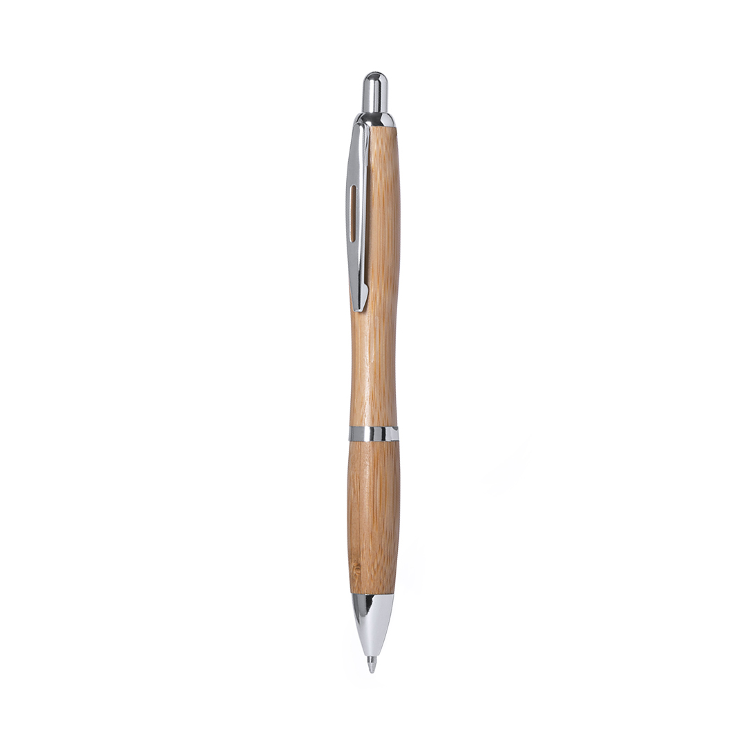 Elegante bolígrafo de mecanismo pulsador con cuerpo en madera de bambú natural, accesorios de acabado metálico en color plateado brillante y clip troquelado. De cartucho jumbo y tinta azul. Carga Jumbo