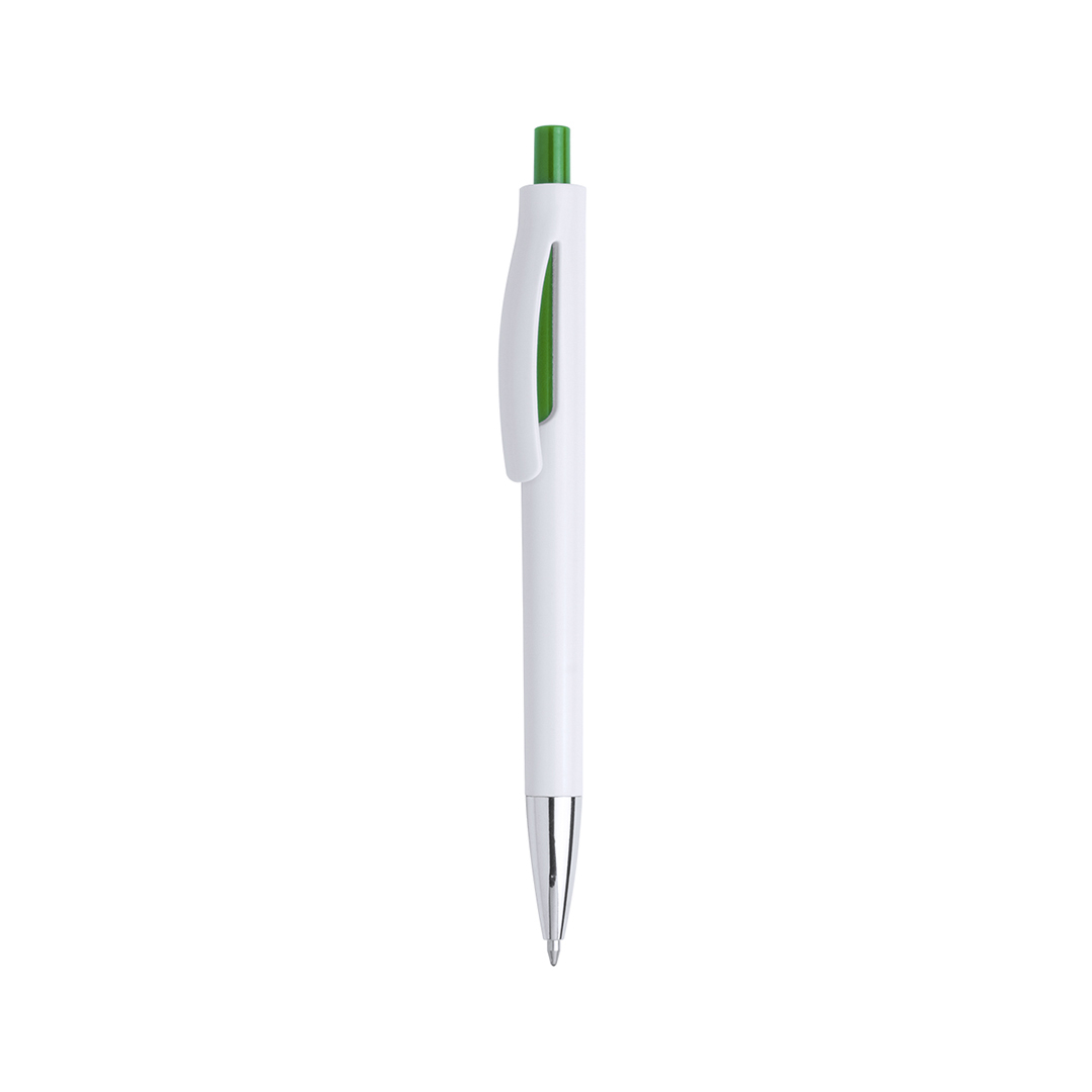 VerdeBolígrafo de mecanismo pulsador de atrevido diseño bicolor con accesorios en vivos colores sólidos y cuerpo de suave acabado en color blanco sólido. Con original clip curvado a juego y punta en acabado brillante. Tinta azul.